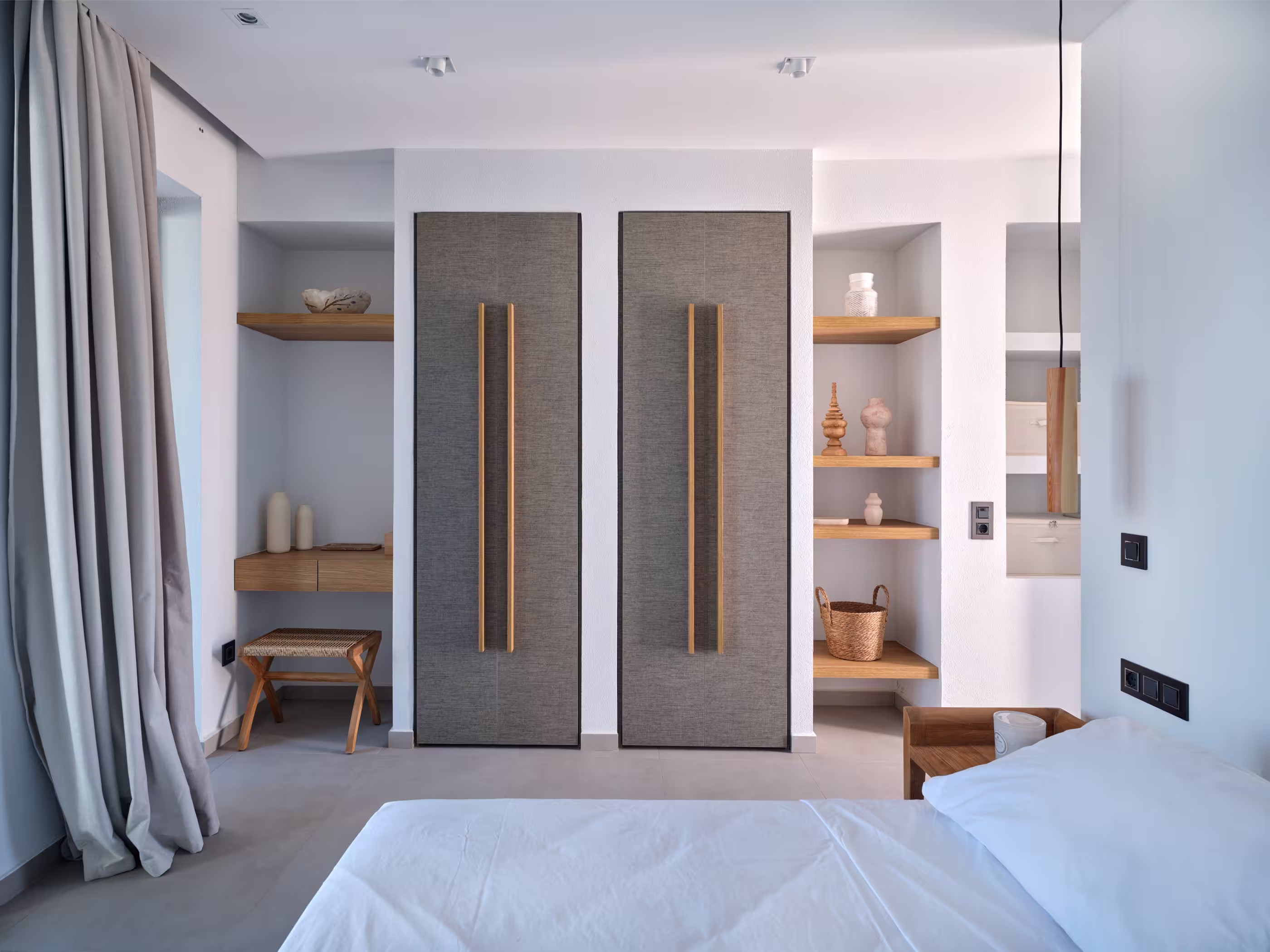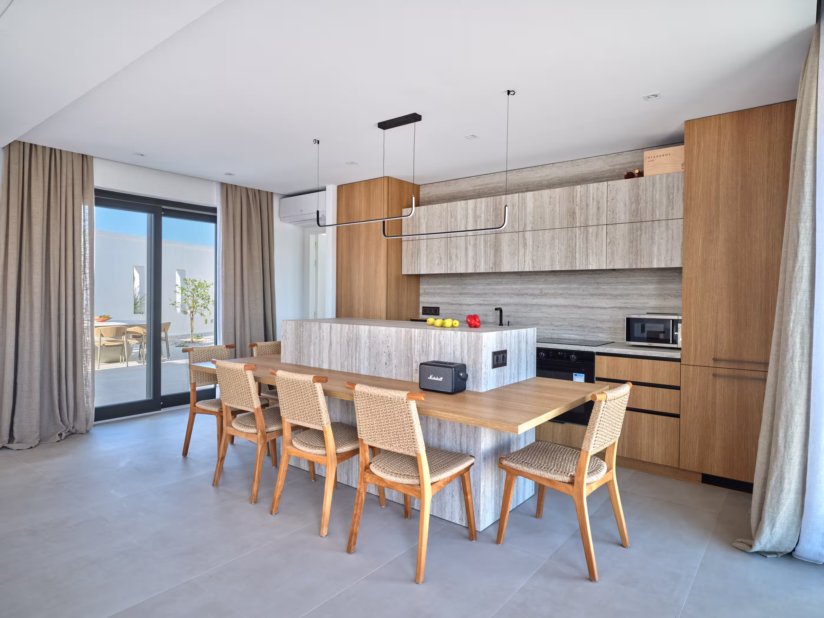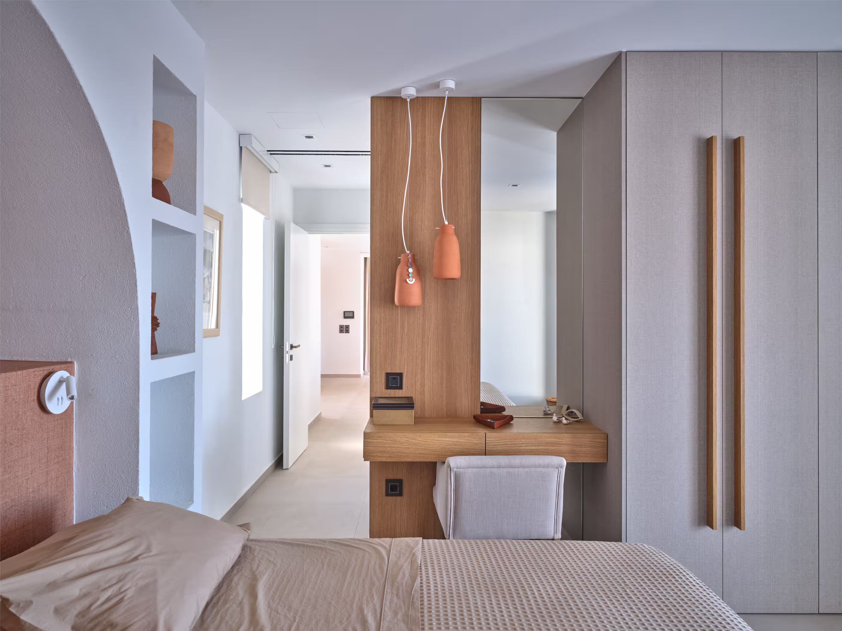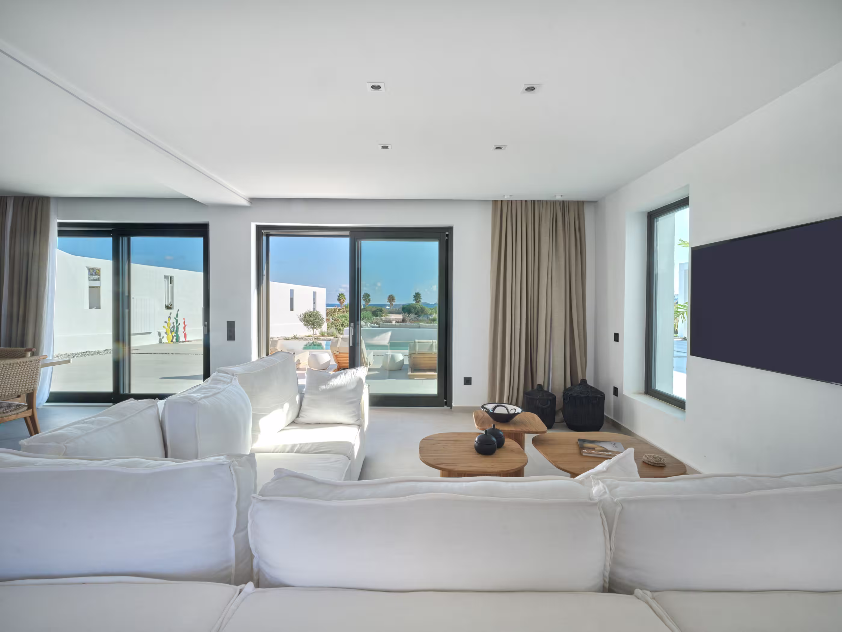 Warm natural interiors blending Cycladic architecture with contemporary comfort.