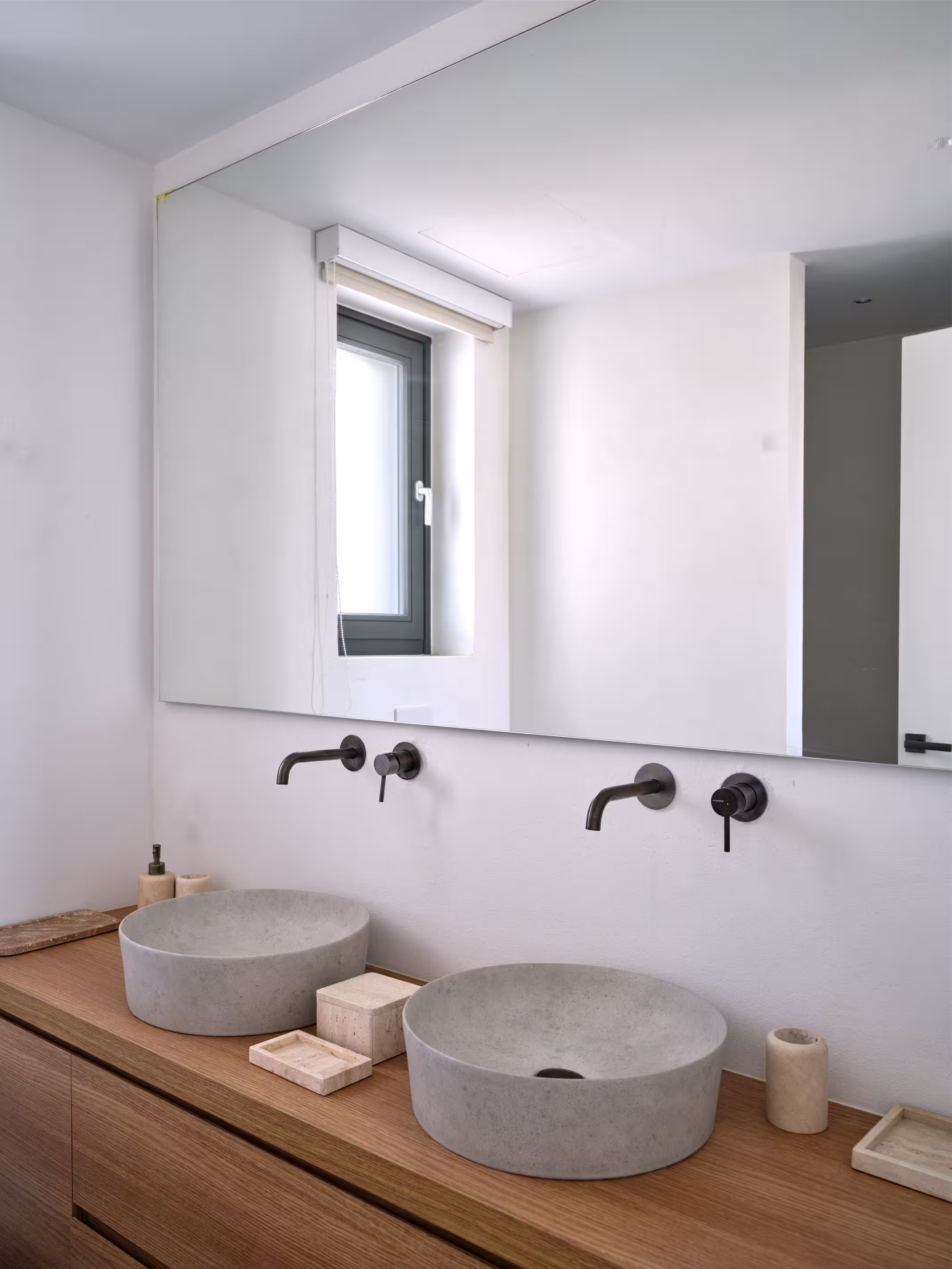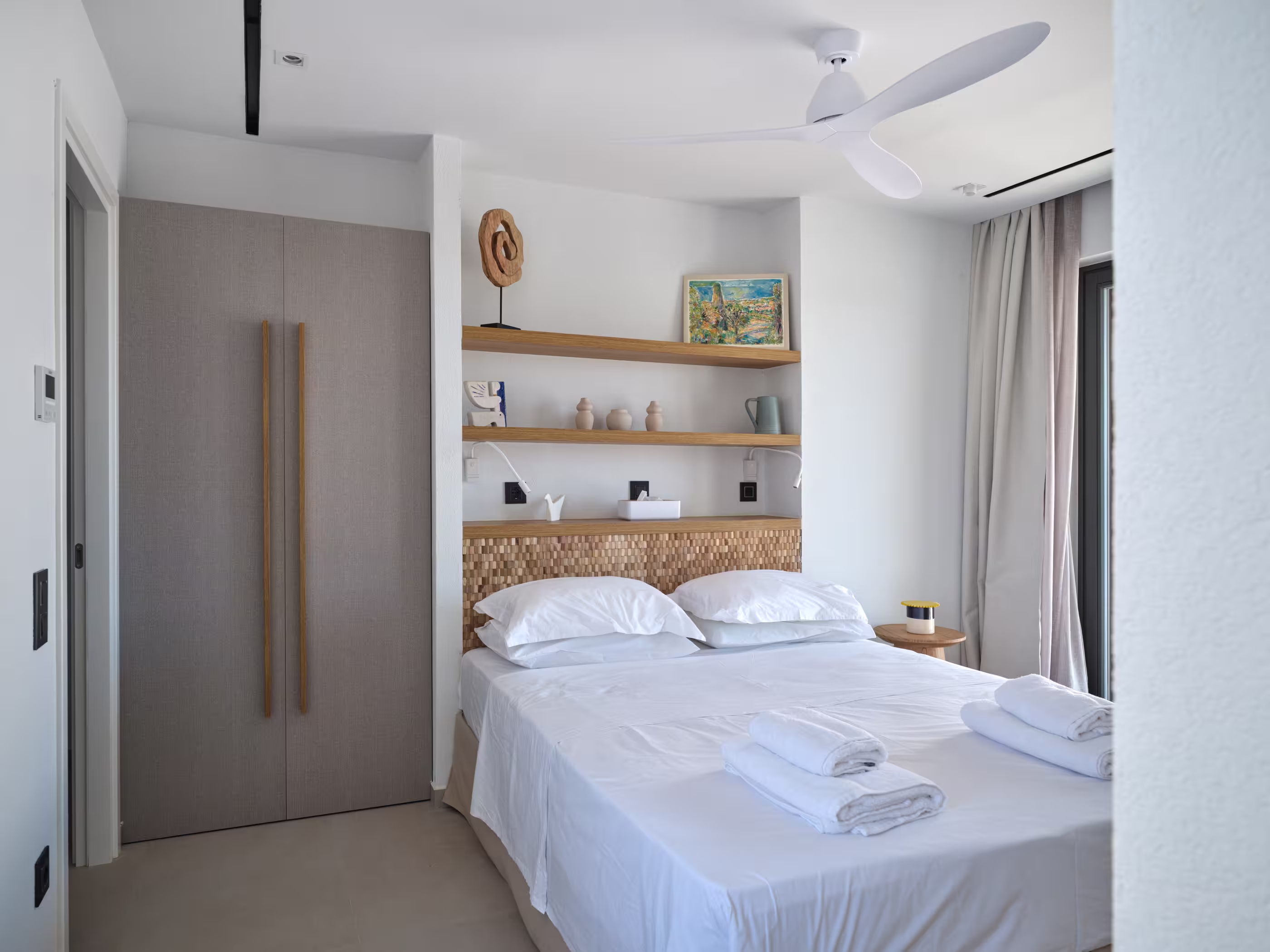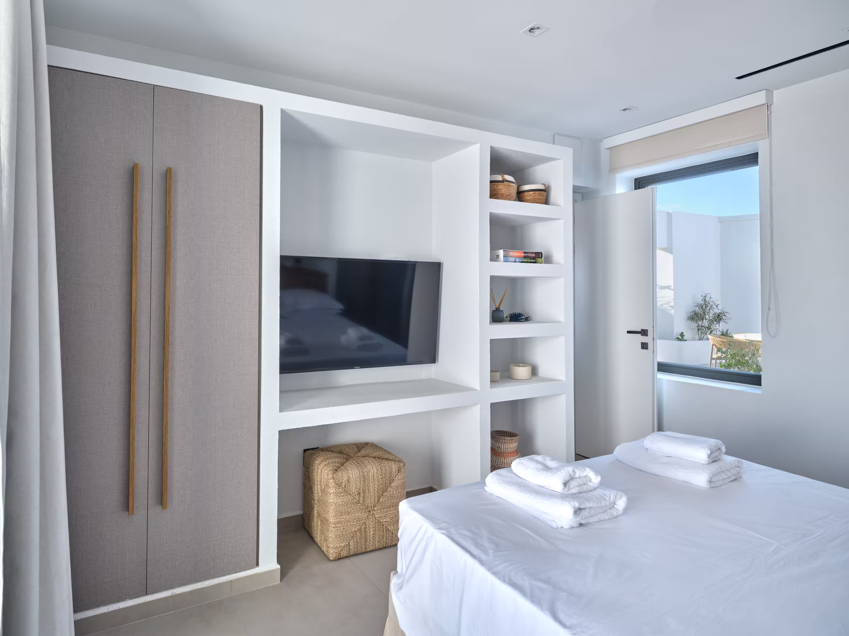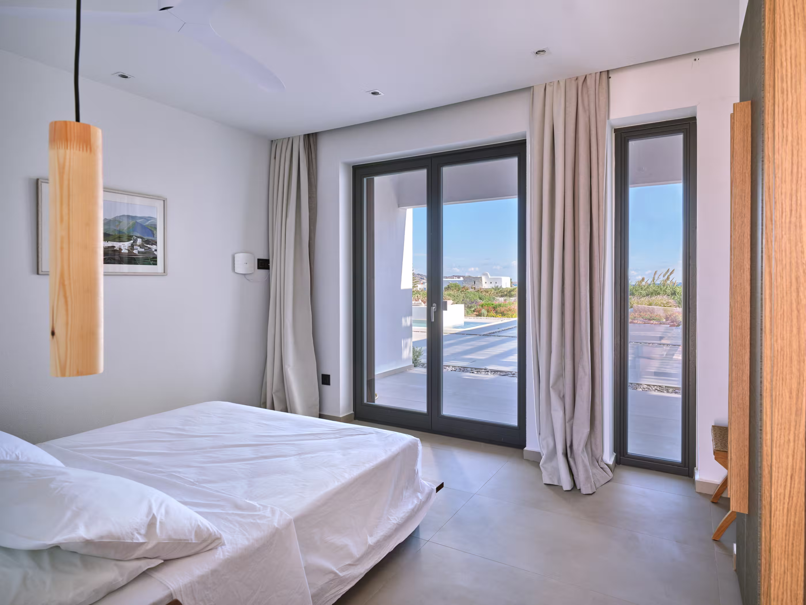 Warm natural interiors blending Cycladic architecture with contemporary comfort.