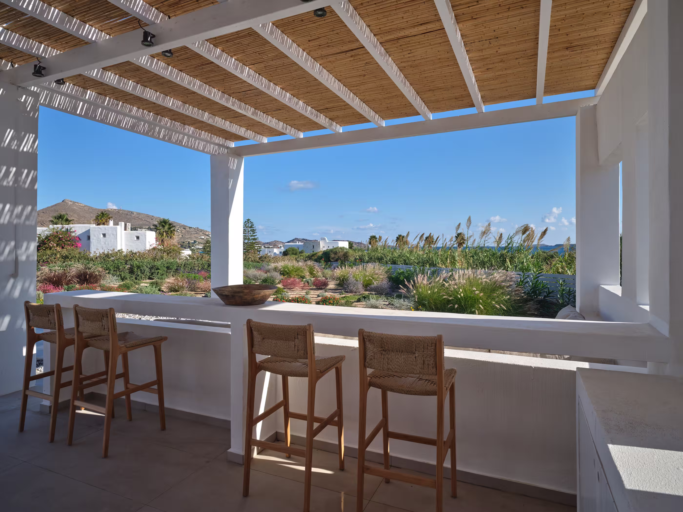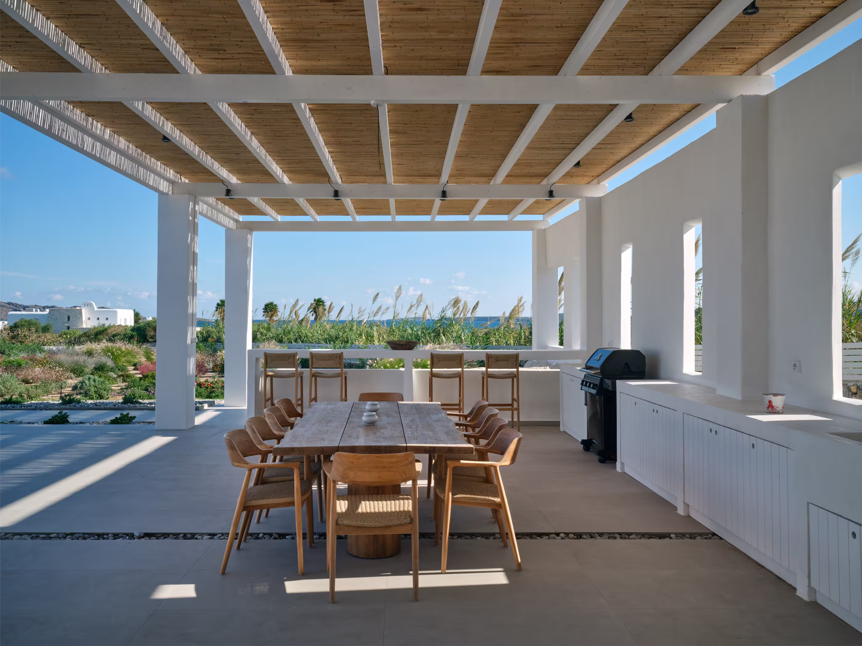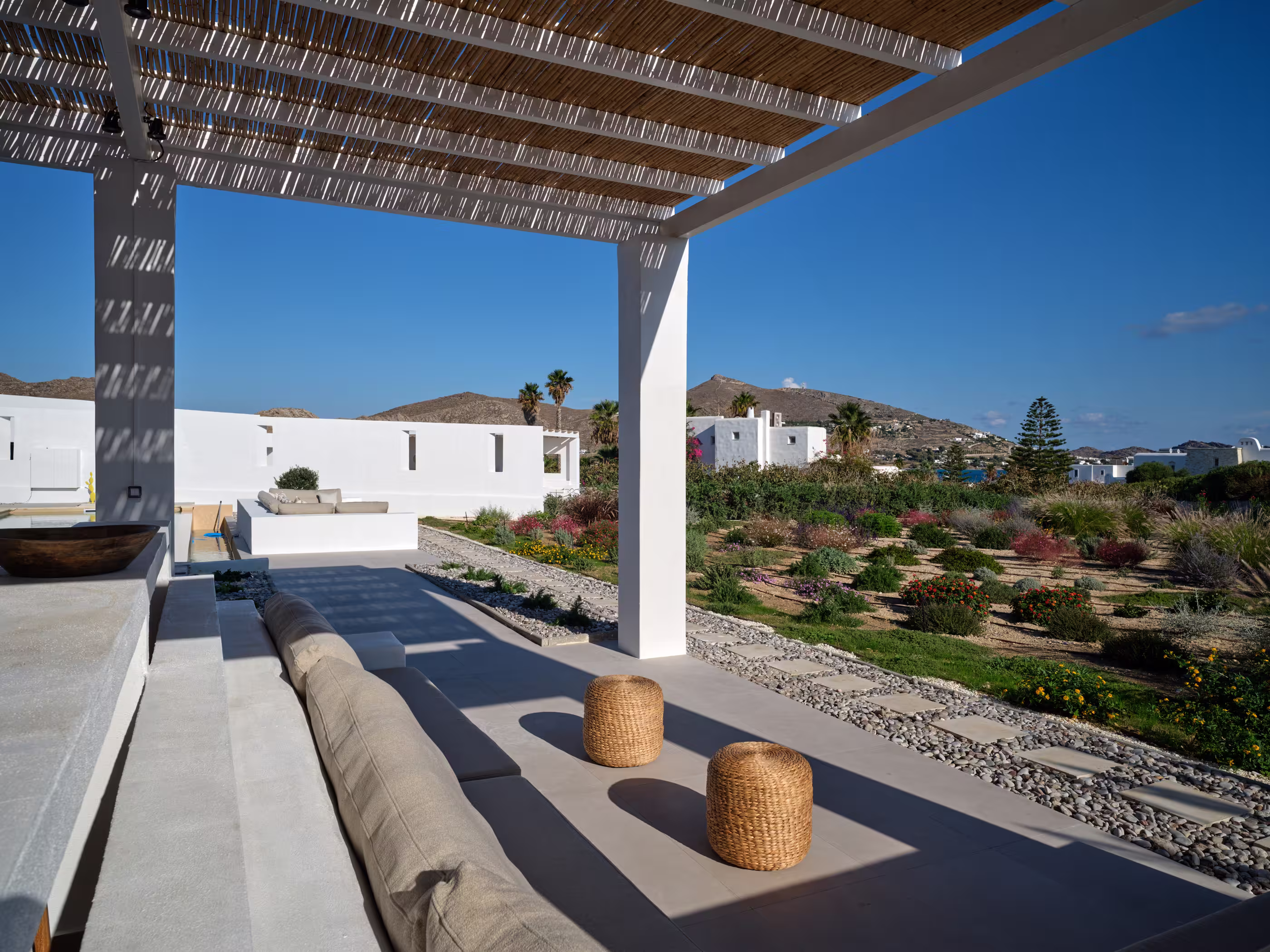 Outdoors, the villa is thoughtfully arranged for elevated leisure and entertaining. A private swimming pool is complemented by a stylish sunken lounge, poolside relaxation areas, and multiple shaded dining spaces, along with a dedicated barbecue zone ideal for long, convivial meals. With its hillside setting, modern comforts, and serene surroundings, Villa Aluma offers a sophisticated escape for guests seeking privacy, design, and proximity to one of Paros’ most vibrant destinations.