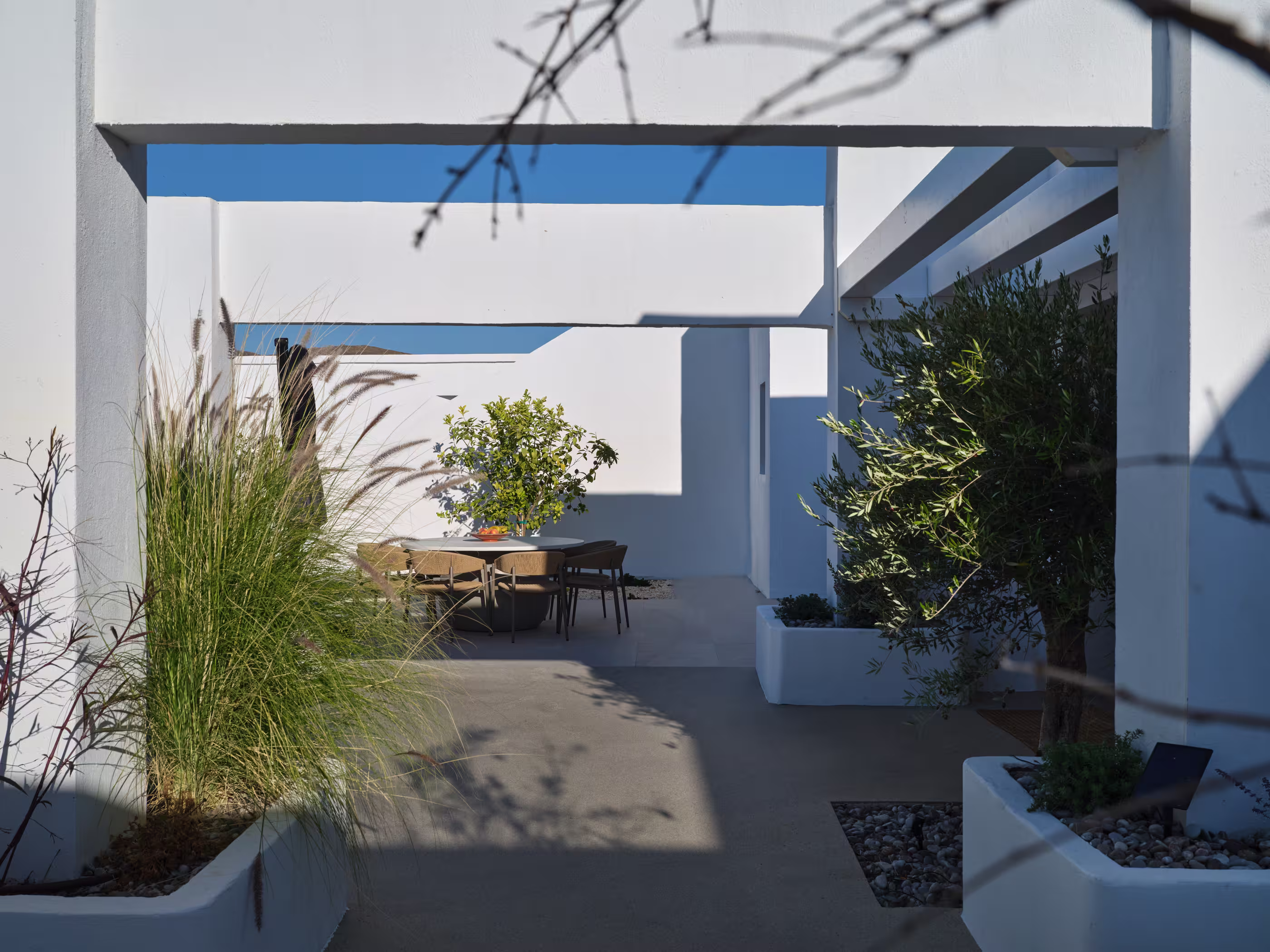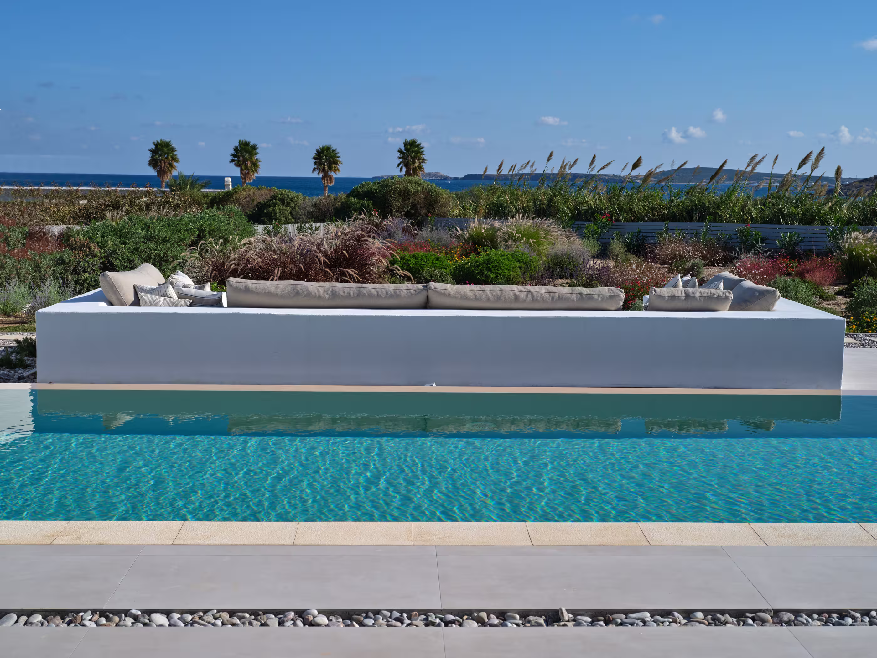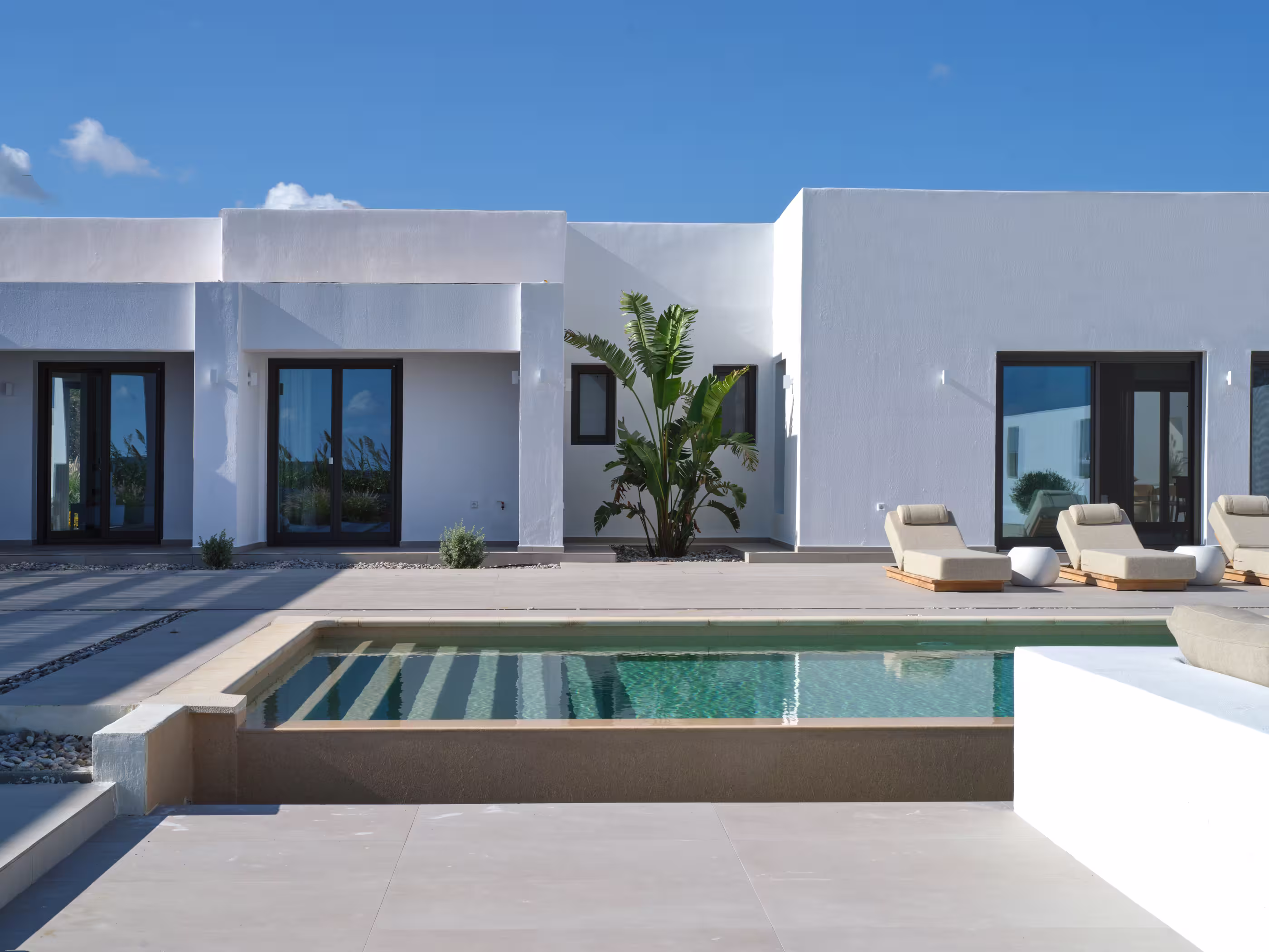 Outdoors, the villa is thoughtfully arranged for elevated leisure and entertaining. A private swimming pool is complemented by a stylish sunken lounge, poolside relaxation areas, and multiple shaded dining spaces, along with a dedicated barbecue zone ideal for long, convivial meals. With its hillside setting, modern comforts, and serene surroundings, Villa Aluma offers a sophisticated escape for guests seeking privacy, design, and proximity to one of Paros’ most vibrant destinations.