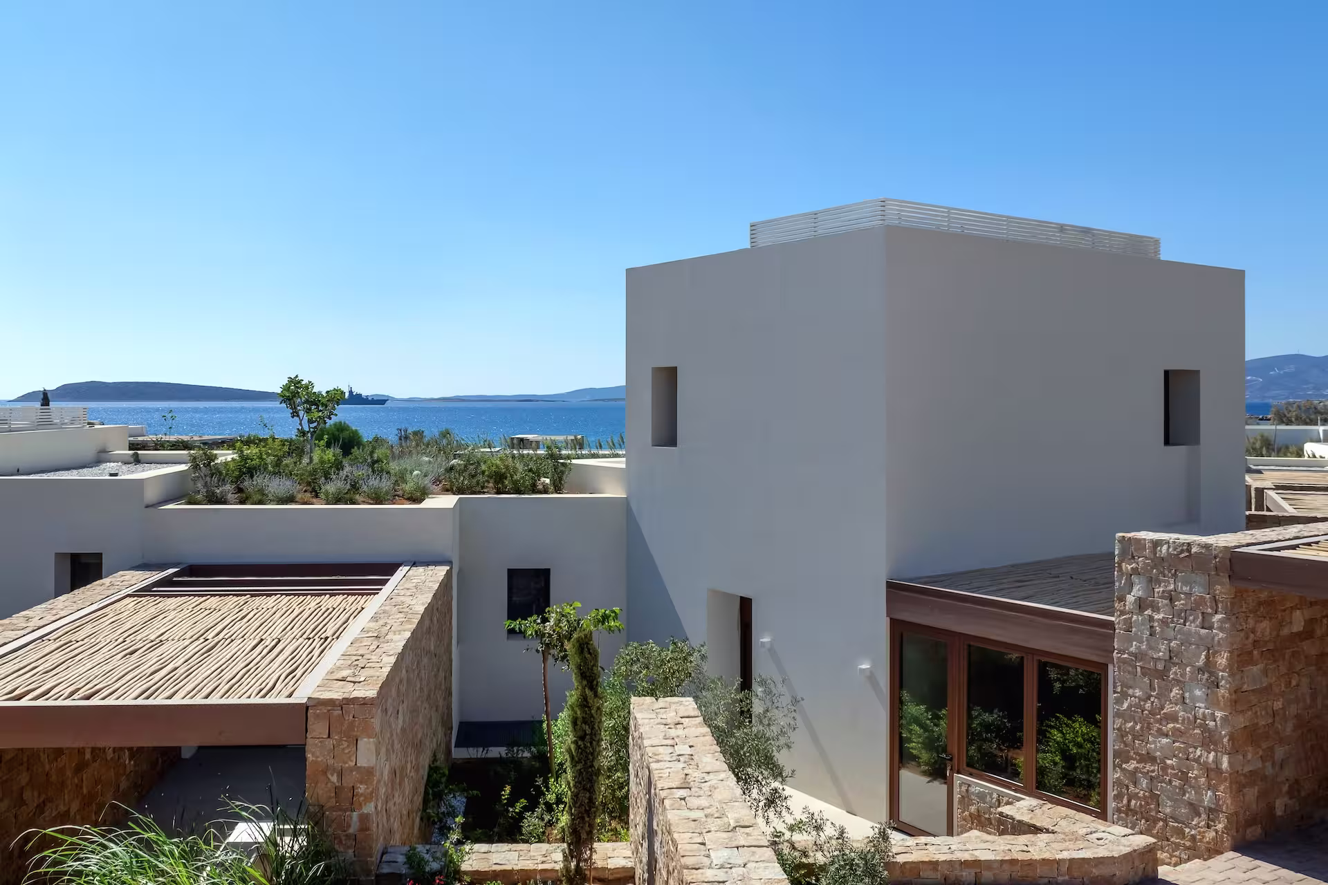 Villa Louna is a bright and spacious retreat designed with a flowing layout that connects indoor comfort with inviting outdoor living. The central lounge opens on one side to the pool terrace with relaxed seating, and on the other to a generous kitchen and family dining area framed by French windows. These lead into a second private garden, giving the villa unique outdoor spaces on both sides of the living room. With four sunlit bedrooms and five bathrooms, the villa is perfectly suited for families or friends seeking style and ease. The top-floor master suite features a private balcony overlooking small rooftop gardens. A private pathway brings guests directly to a quiet pebble beach, blending villa living with the Aegean Sea.
