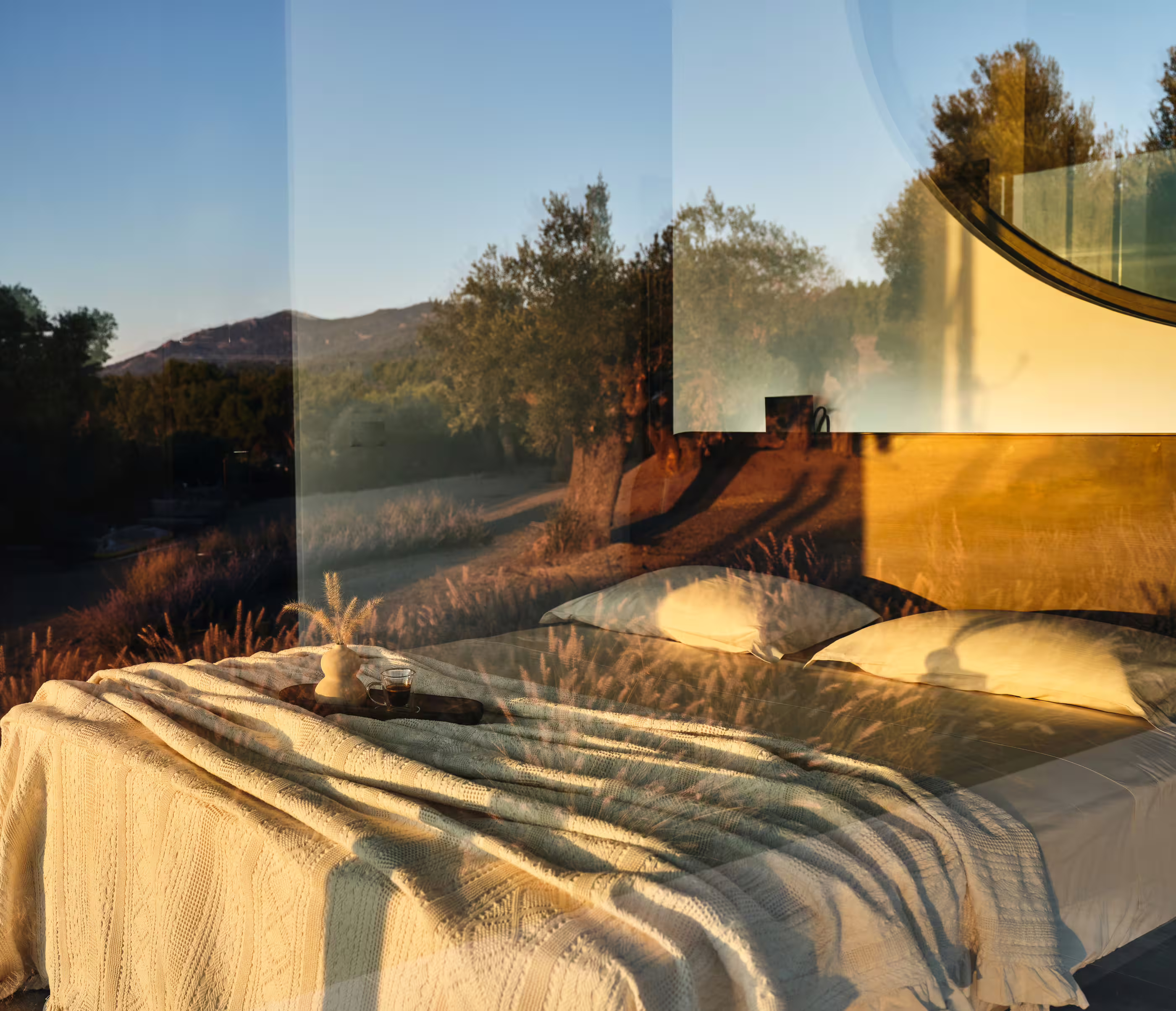 The villa is immersed in private gardens, surrounded by olive trees, Mediterranean plants, and herbs. Highlights include multiple lounge areas for relaxing and admiring the sunset behind Mount Olympus. The roof garden offers a breathtaking 360° view, complete with a sofa bed for stargazing. Outdoor spaces include a poolside living room, fireplace lounge, and a cozy swing corner.
