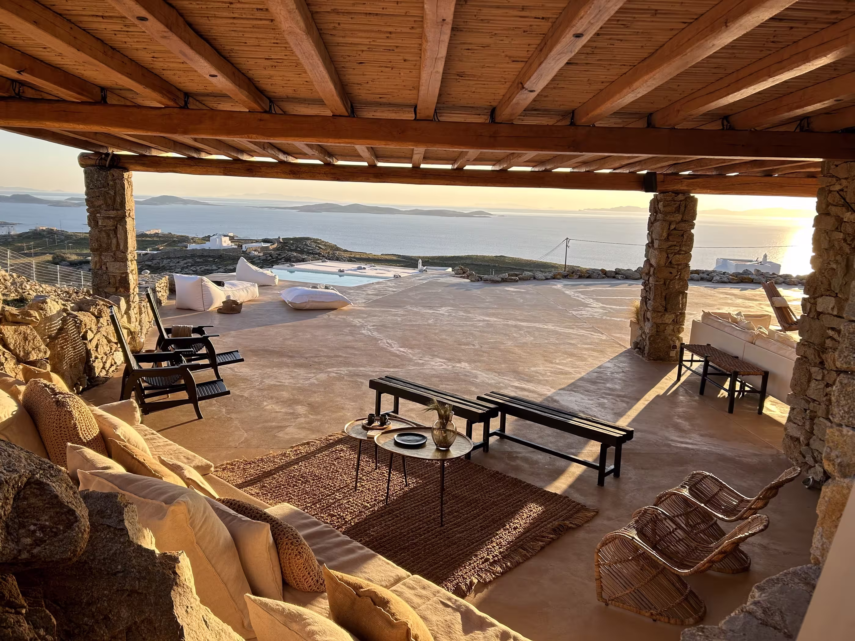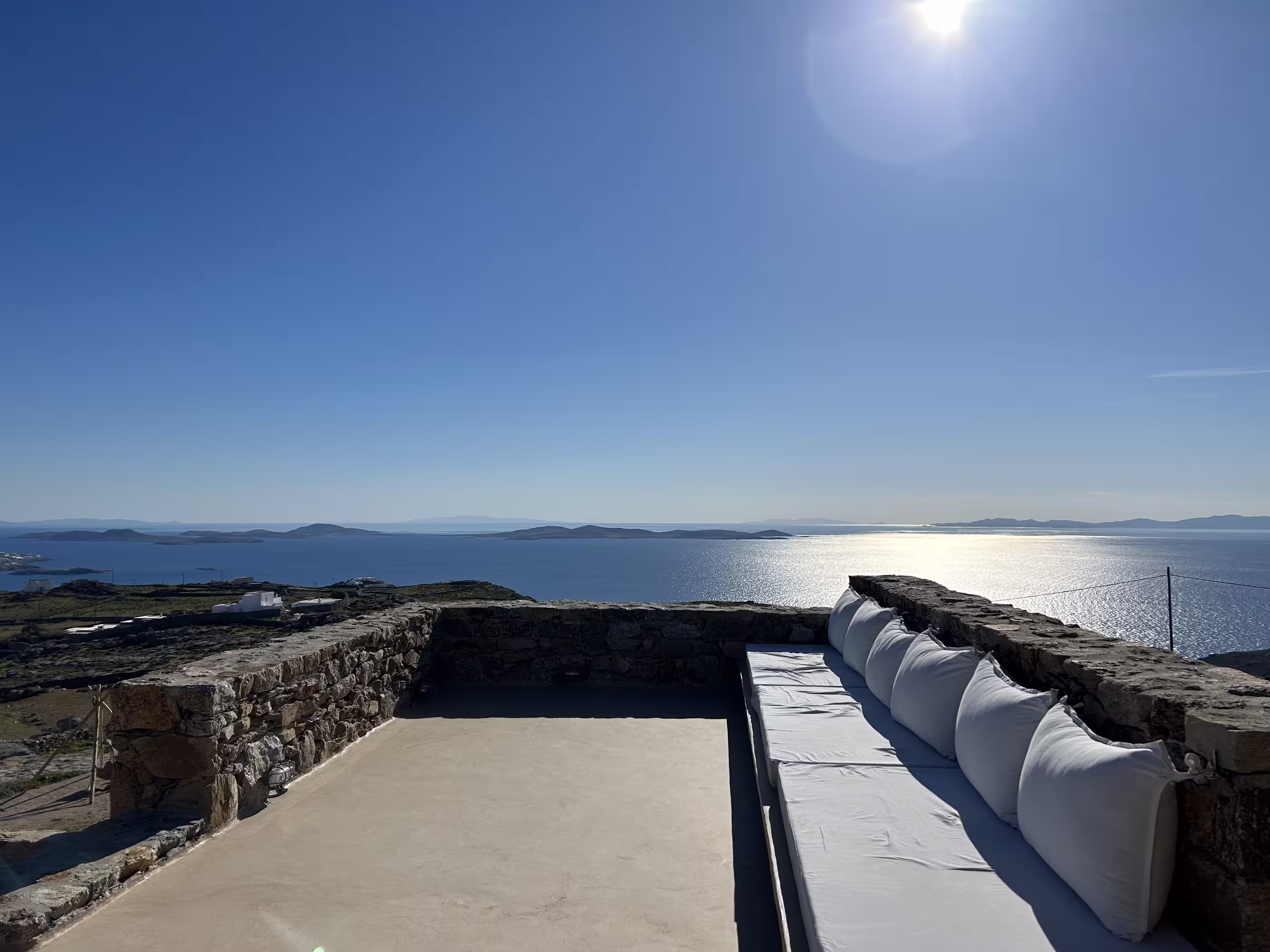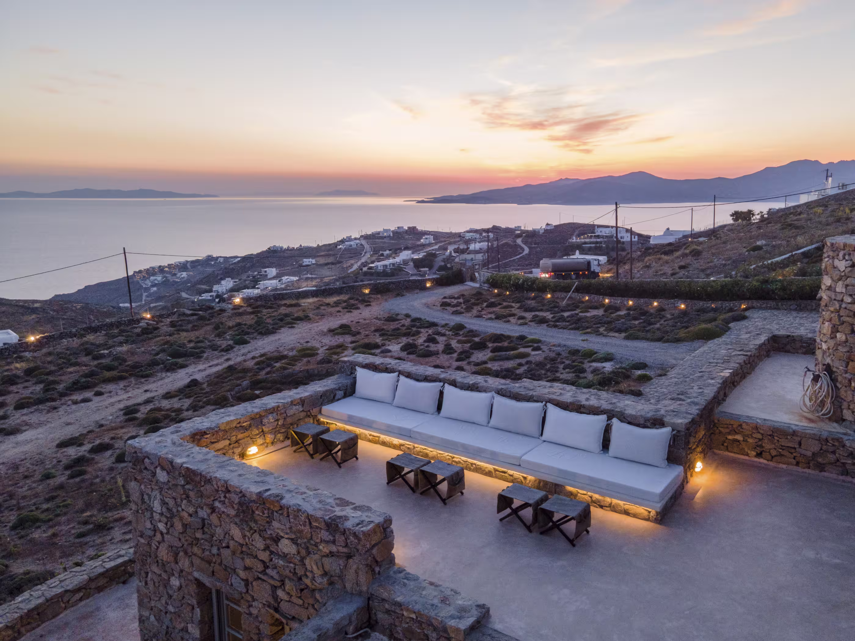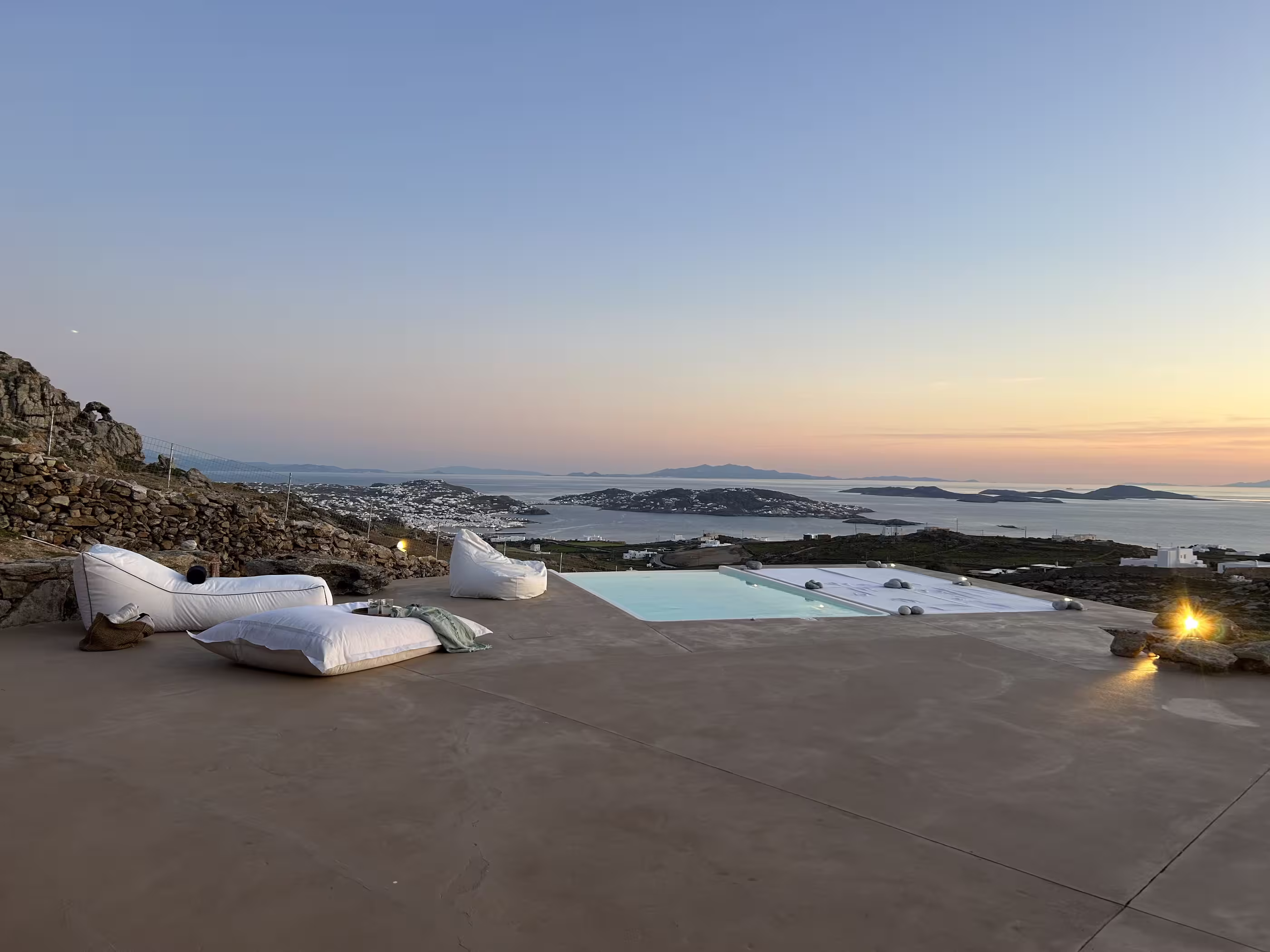 Villa Onda rests in the quiet hills of Kastro, surrounded by open sky and sweeping views of Mykonos Town, Delos, Rhenia, and the deep blue Aegean. Designed across three levels, the villa offers seven en-suite bedrooms, two private pools, a jacuzzi terrace, and generous outdoor living spaces that capture the island’s most striking sunsets. Natural stone, whitewashed walls, and refined interiors create a calm, welcoming atmosphere. With two fully equipped kitchens, spacious lounges, independent entrances, and a grand dining terrace for large gatherings, the villa ensures both comfort and privacy. A serene setting, cinematic views, and modern elegance make villa Onda a standout retreat in Mykonos.