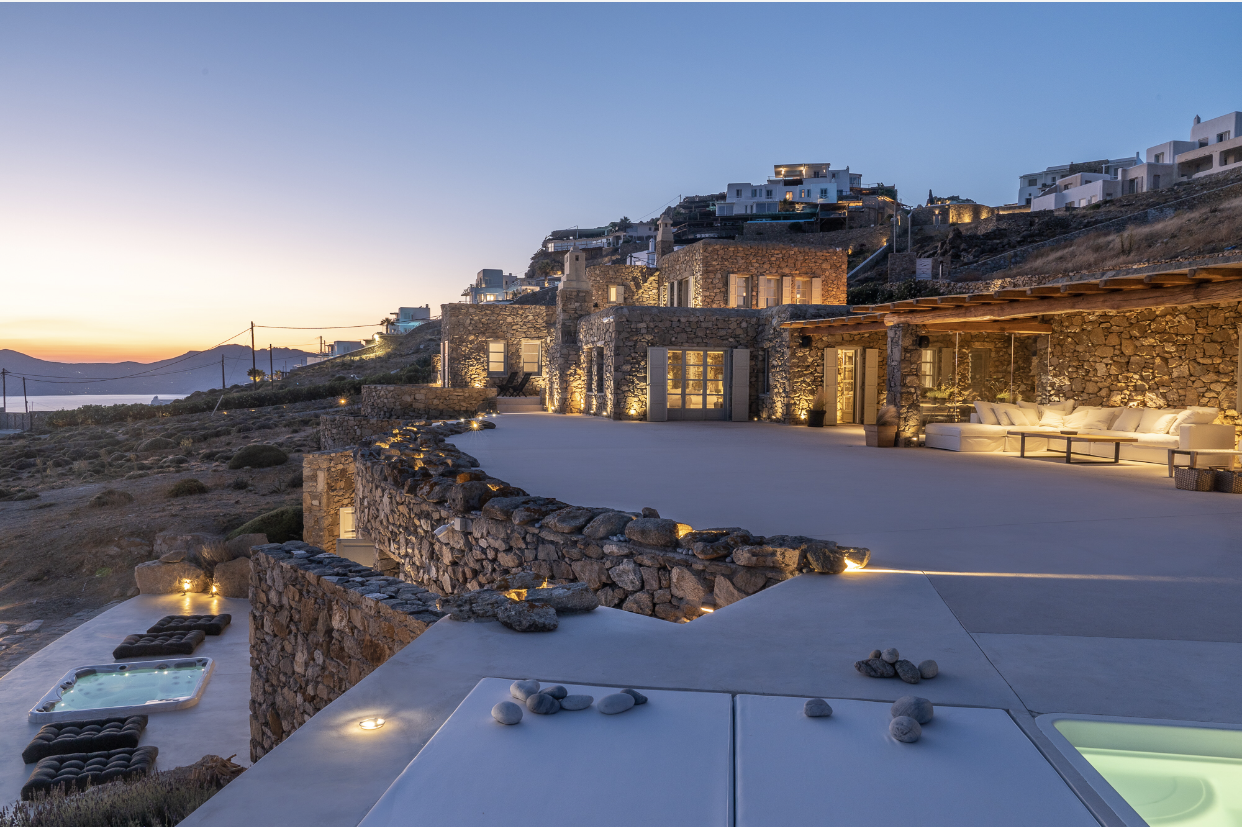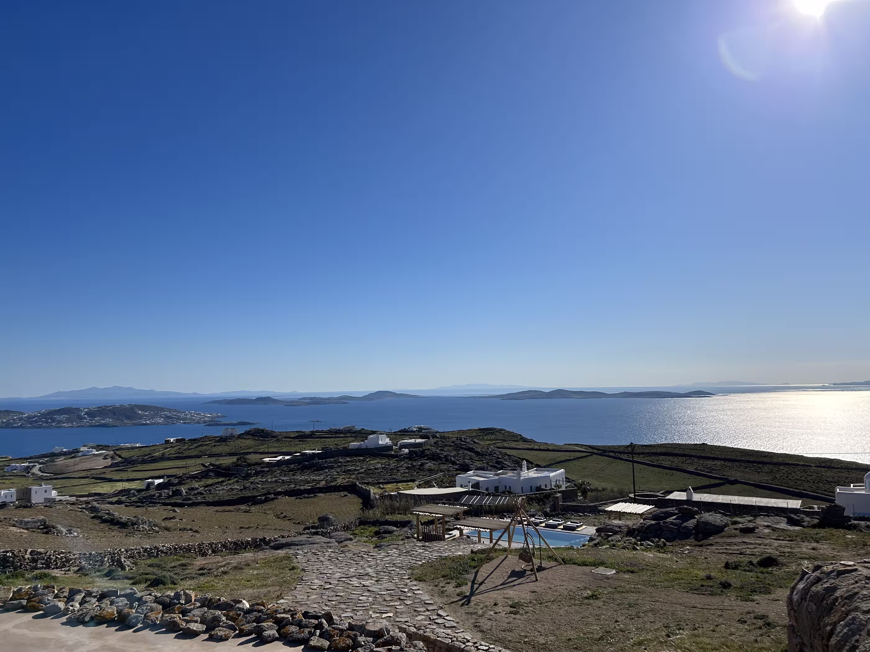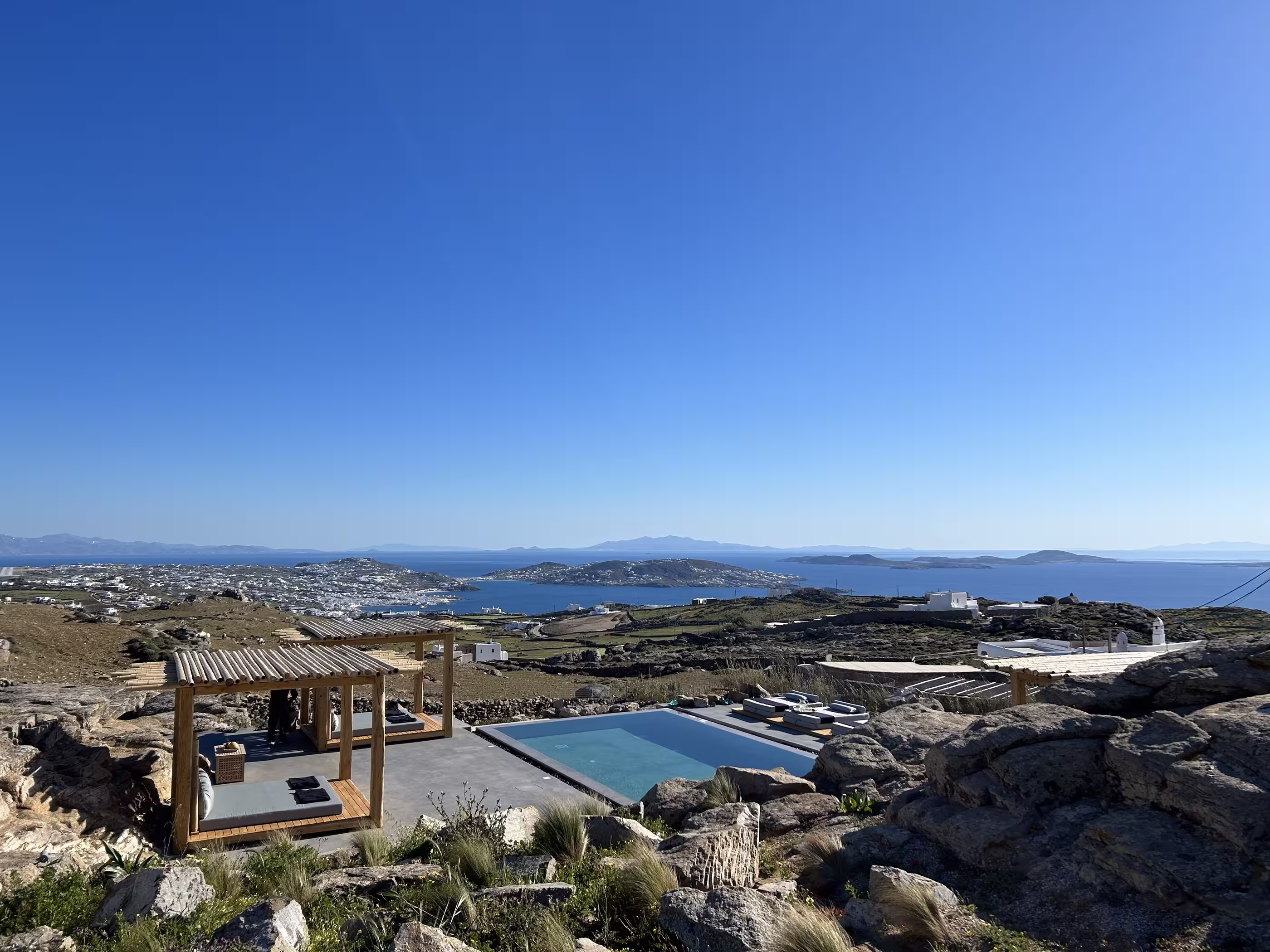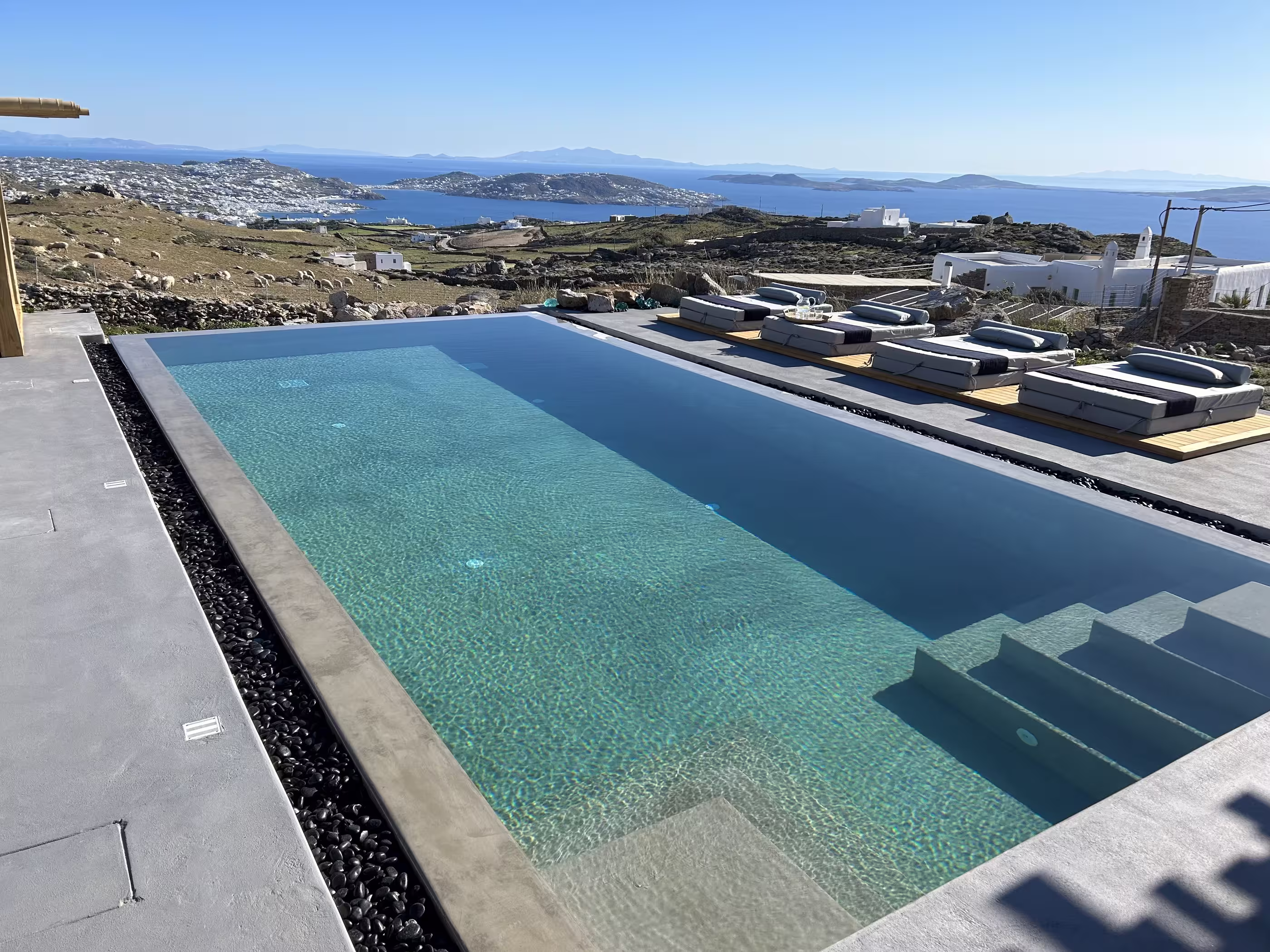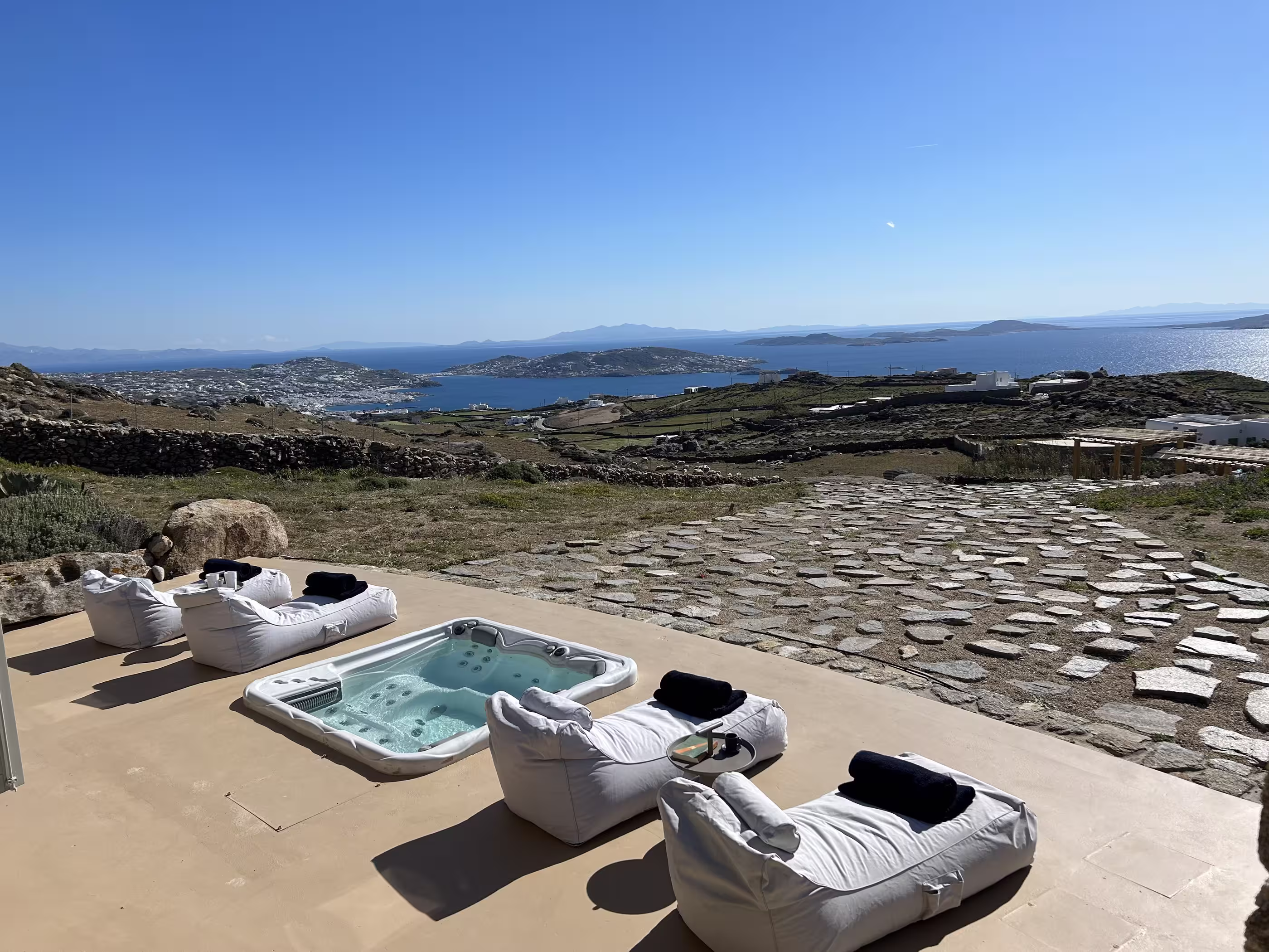 Villa Onda rests in the quiet hills of Kastro, surrounded by open sky and sweeping views of Mykonos Town, Delos, Rhenia, and the deep blue Aegean. Designed across three levels, the villa offers seven en-suite bedrooms, two private pools, a jacuzzi terrace, and generous outdoor living spaces that capture the island’s most striking sunsets. Natural stone, whitewashed walls, and refined interiors create a calm, welcoming atmosphere. With two fully equipped kitchens, spacious lounges, independent entrances, and a grand dining terrace for large gatherings, the villa ensures both comfort and privacy. A serene setting, cinematic views, and modern elegance make villa Onda a standout retreat in Mykonos.