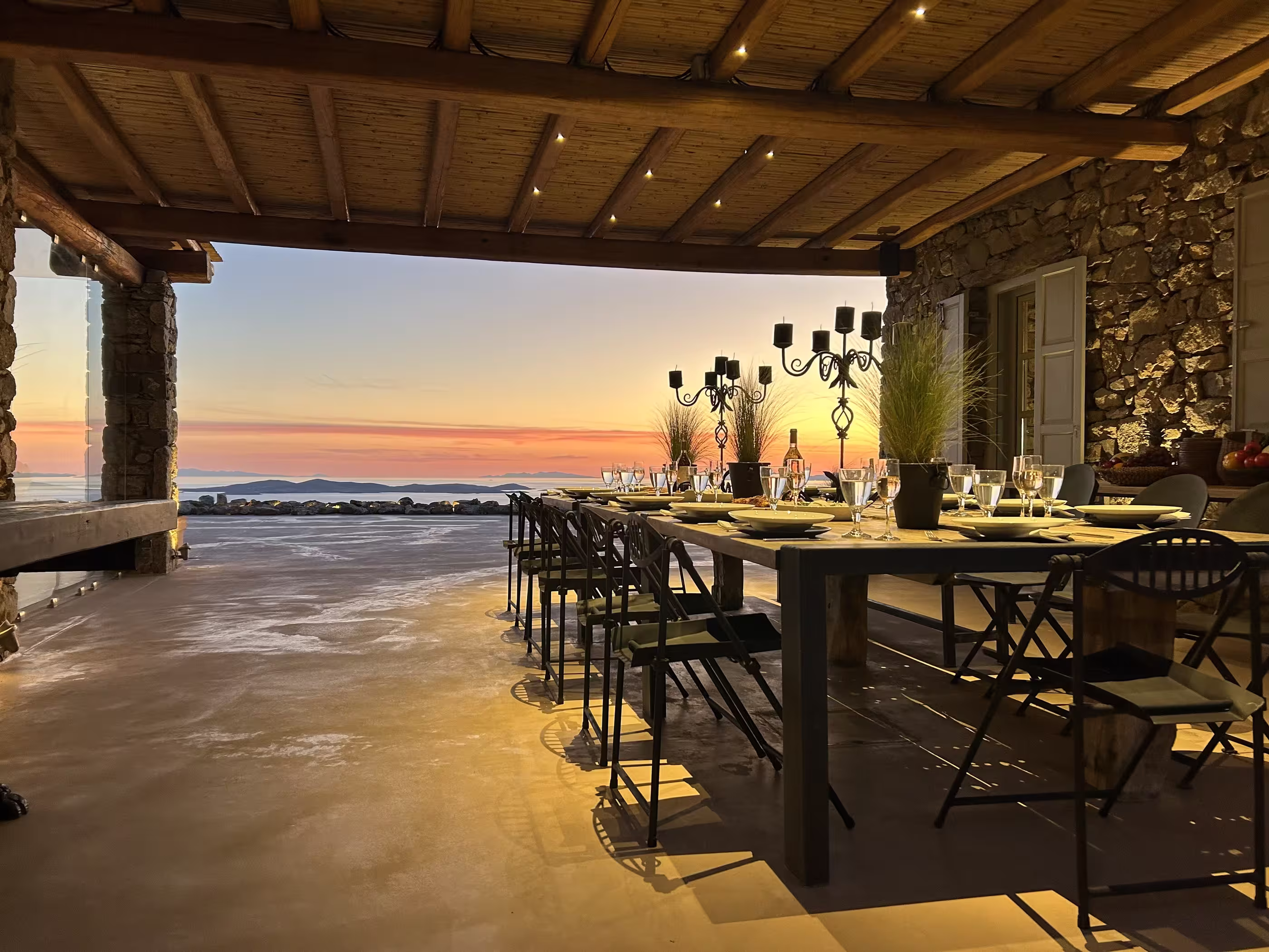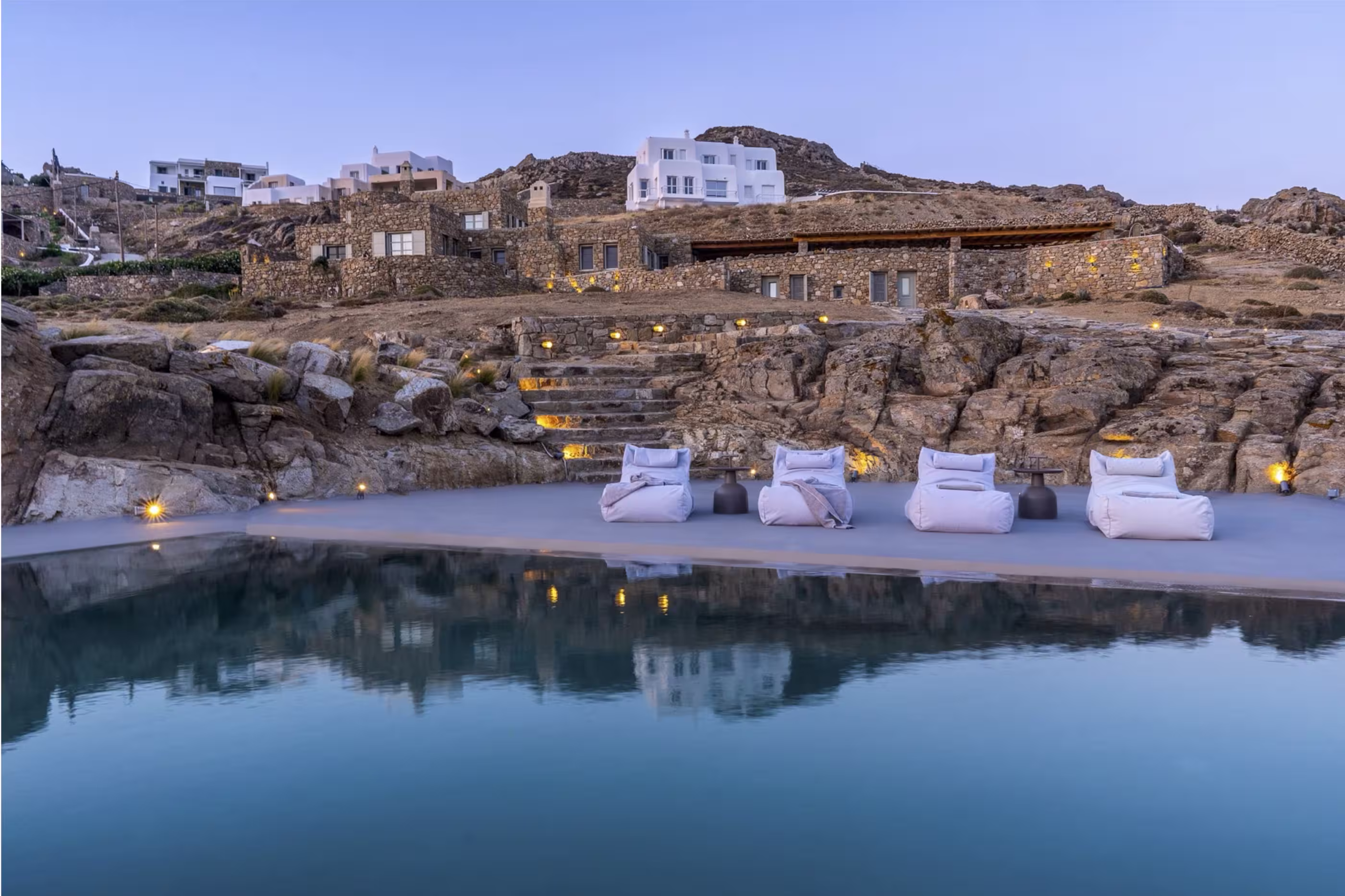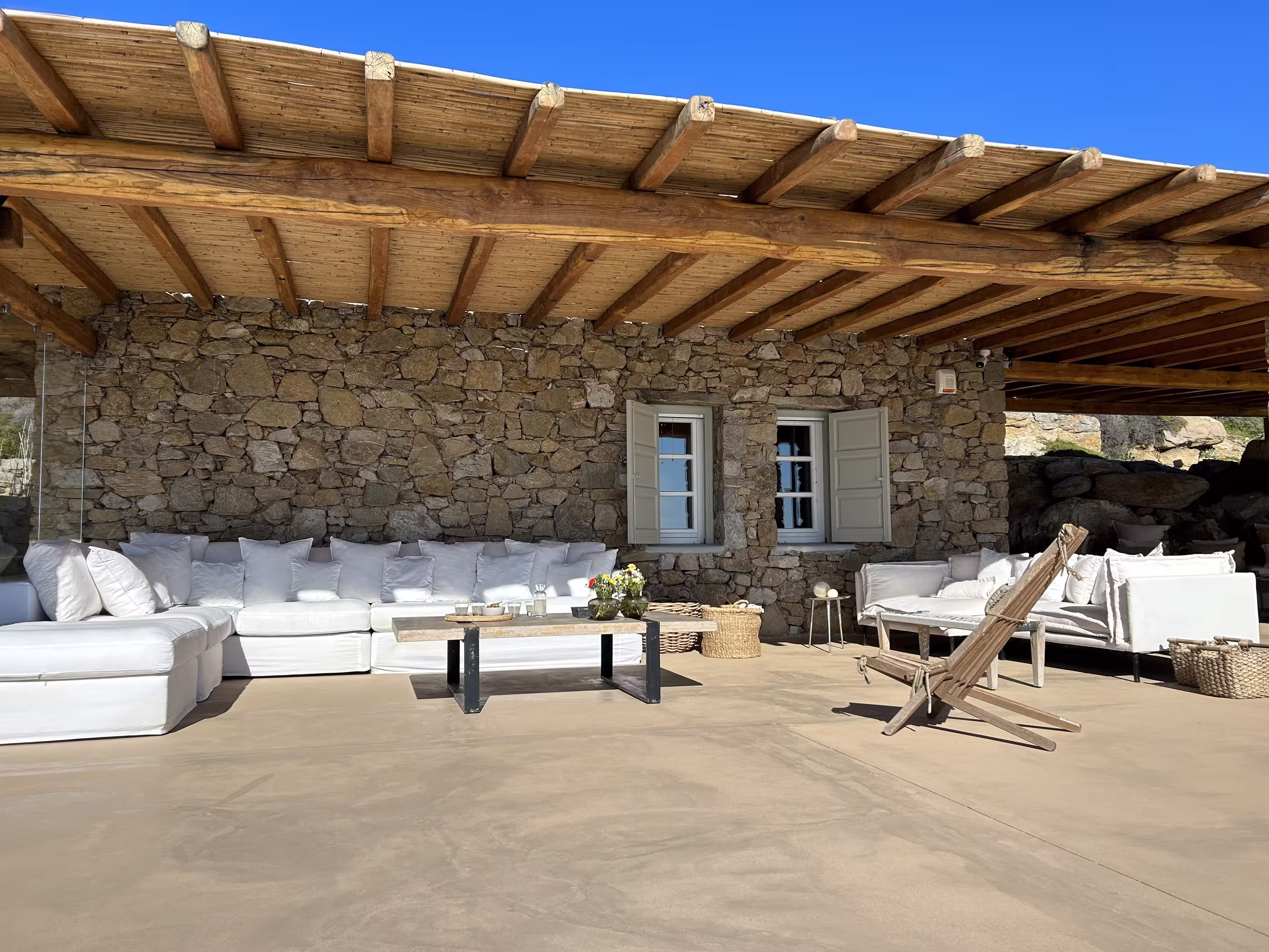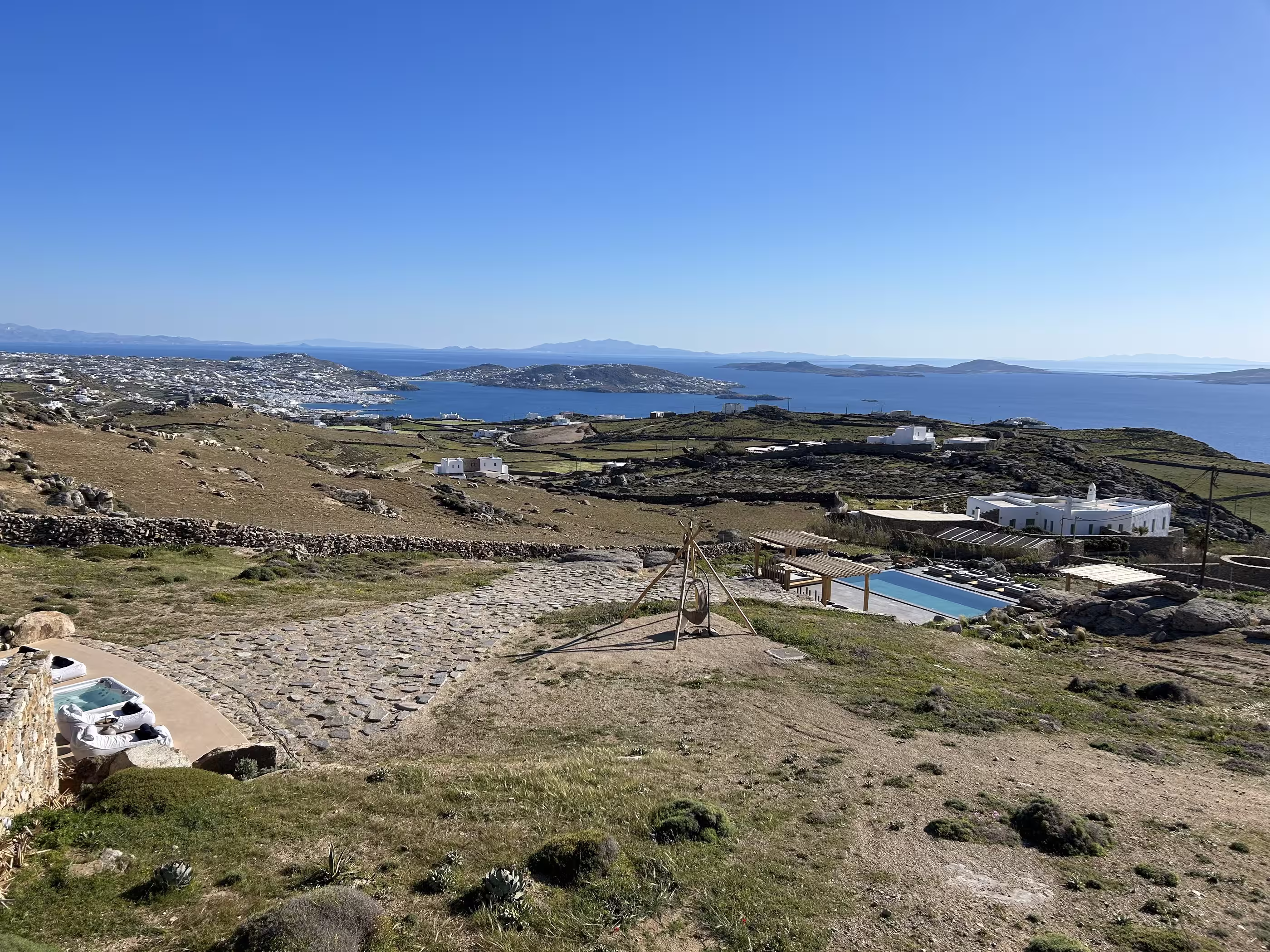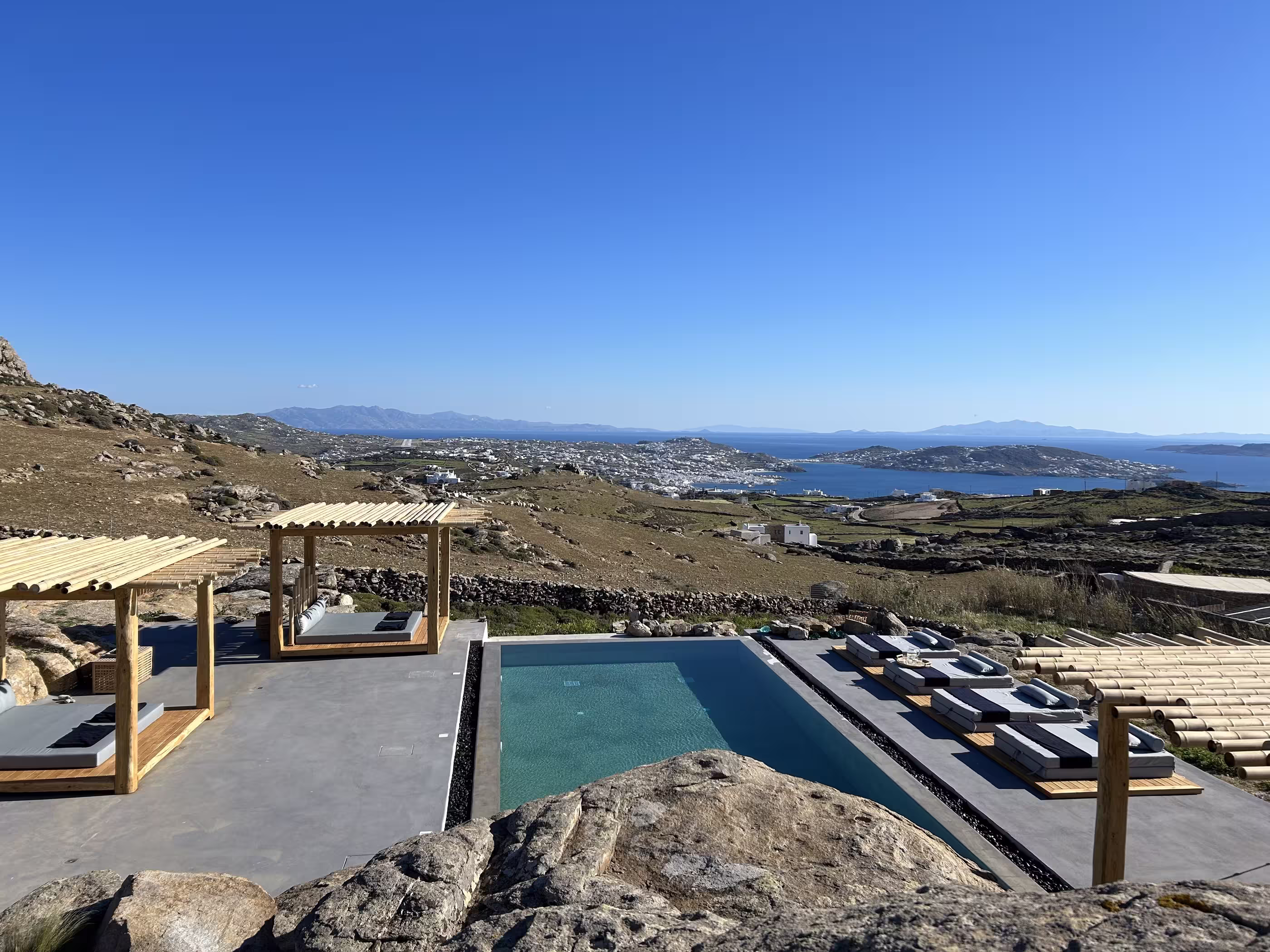 Villa Onda rests in the quiet hills of Kastro, surrounded by open sky and sweeping views of Mykonos Town, Delos, Rhenia, and the deep blue Aegean. Designed across three levels, the villa offers seven en-suite bedrooms, two private pools, a jacuzzi terrace, and generous outdoor living spaces that capture the island’s most striking sunsets. Natural stone, whitewashed walls, and refined interiors create a calm, welcoming atmosphere. With two fully equipped kitchens, spacious lounges, independent entrances, and a grand dining terrace for large gatherings, the villa ensures both comfort and privacy. A serene setting, cinematic views, and modern elegance make villa Onda a standout retreat in Mykonos.