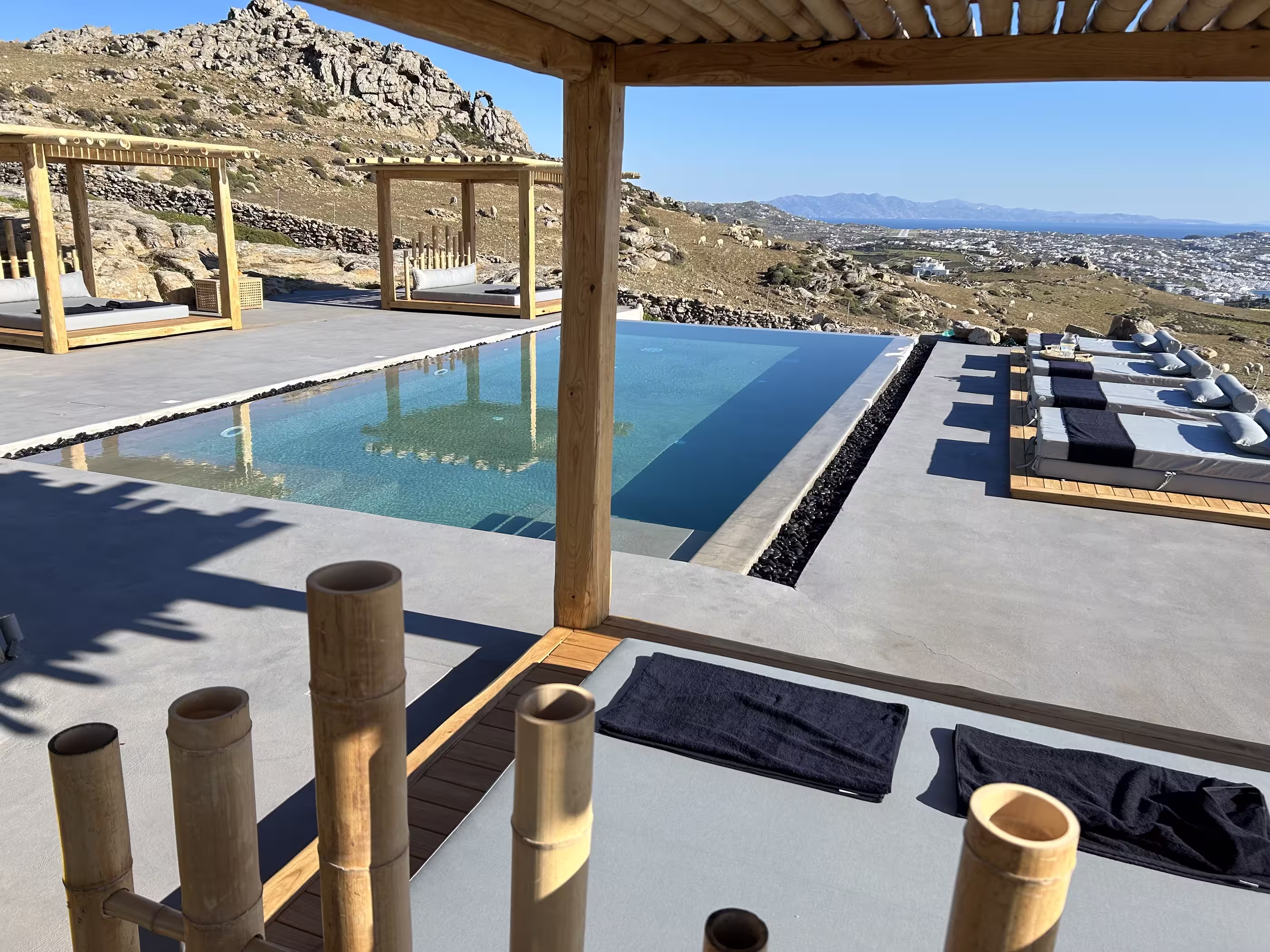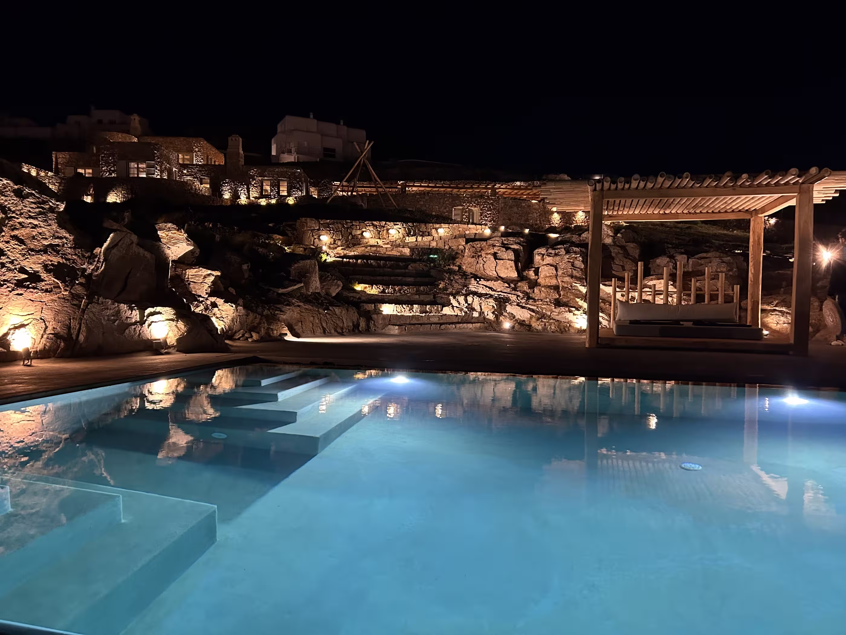 - Small reverse-swimming pool (6 × 3m) and multiple lounge areas