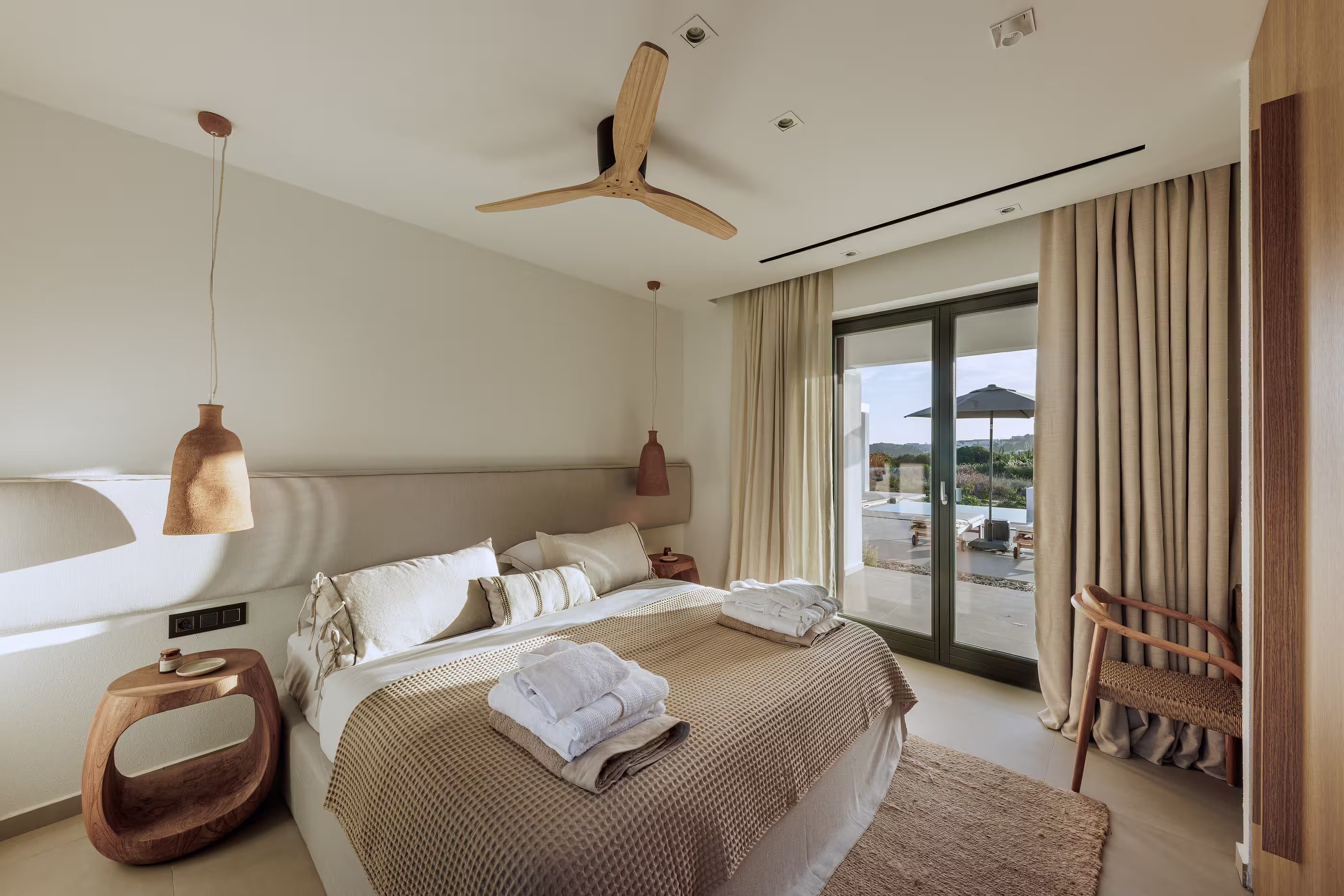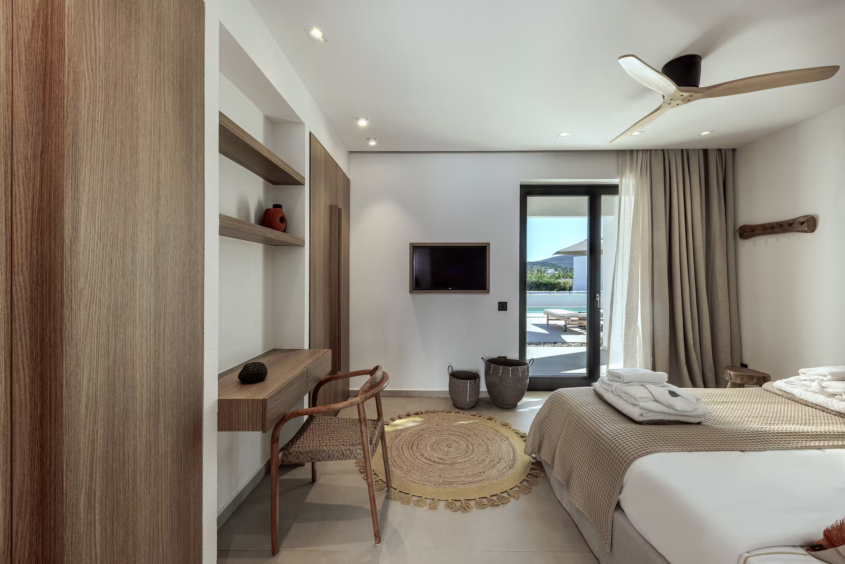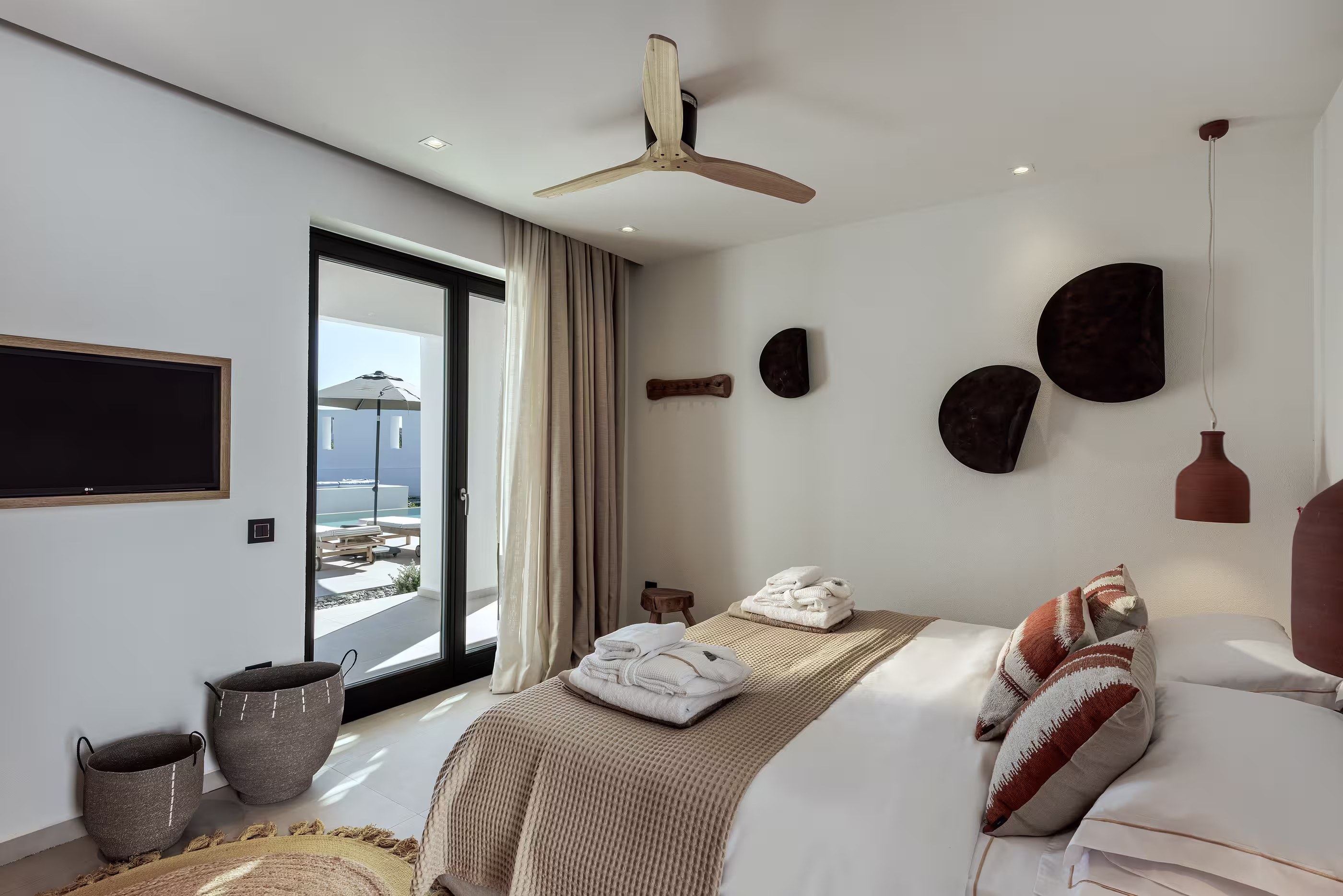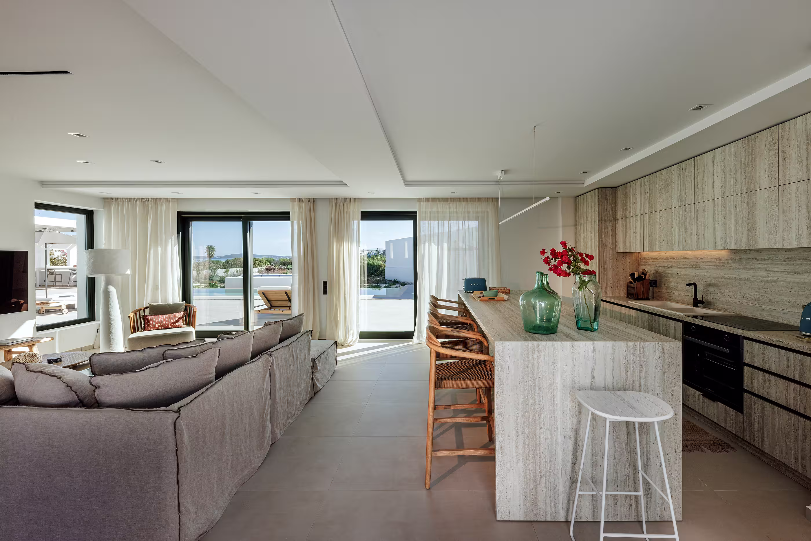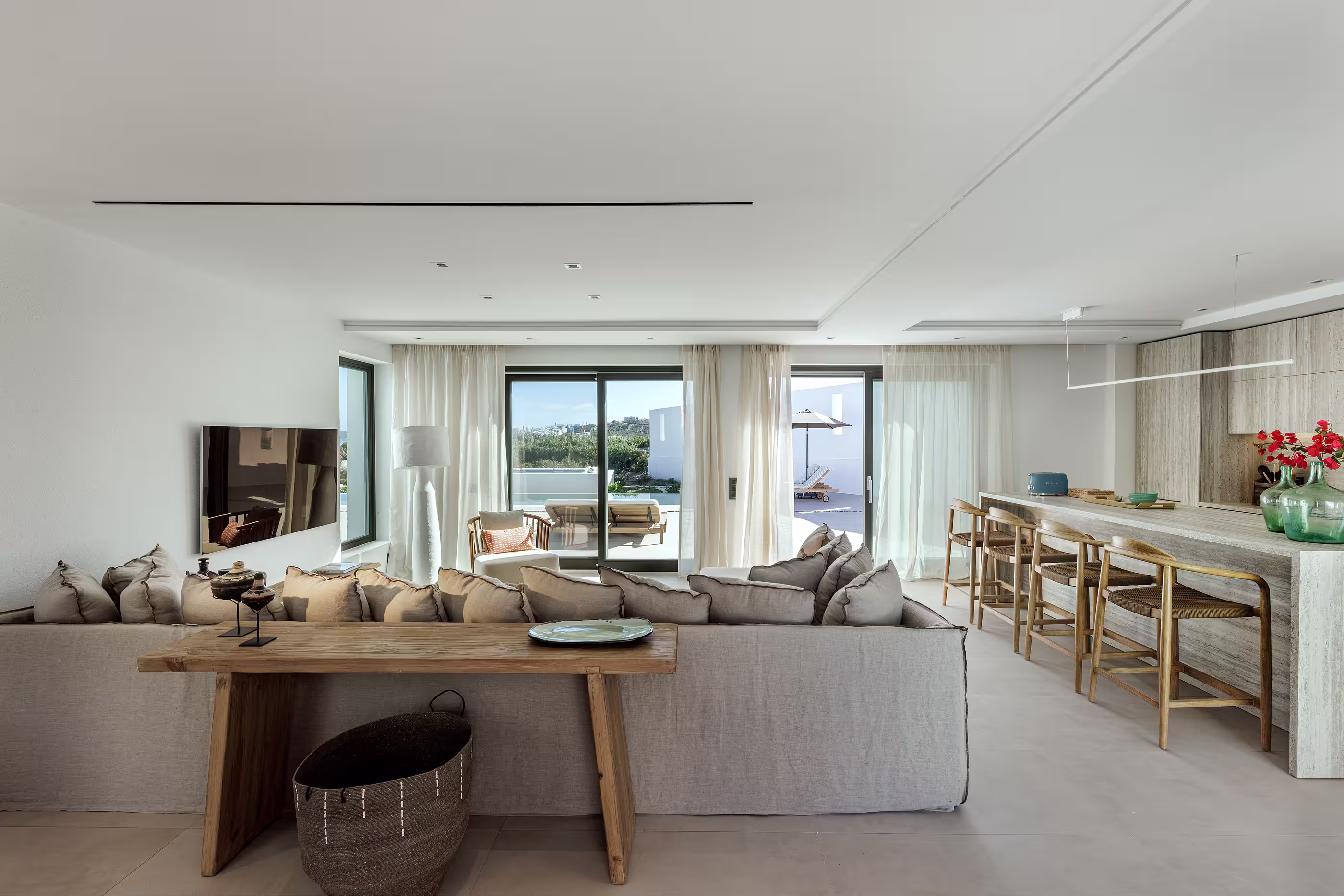 Warm natural interiors blending Cycladic architecture with contemporary comfort.
