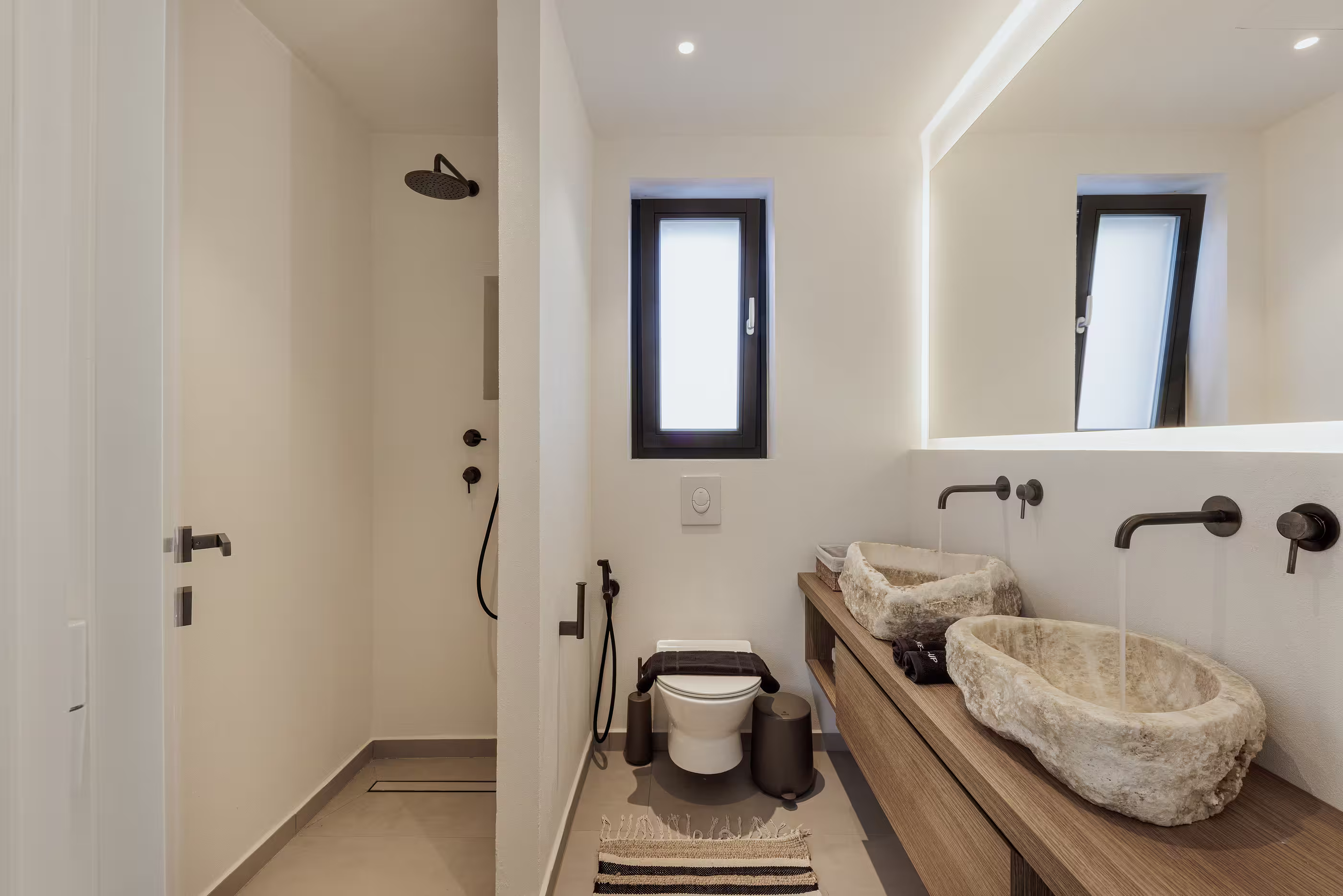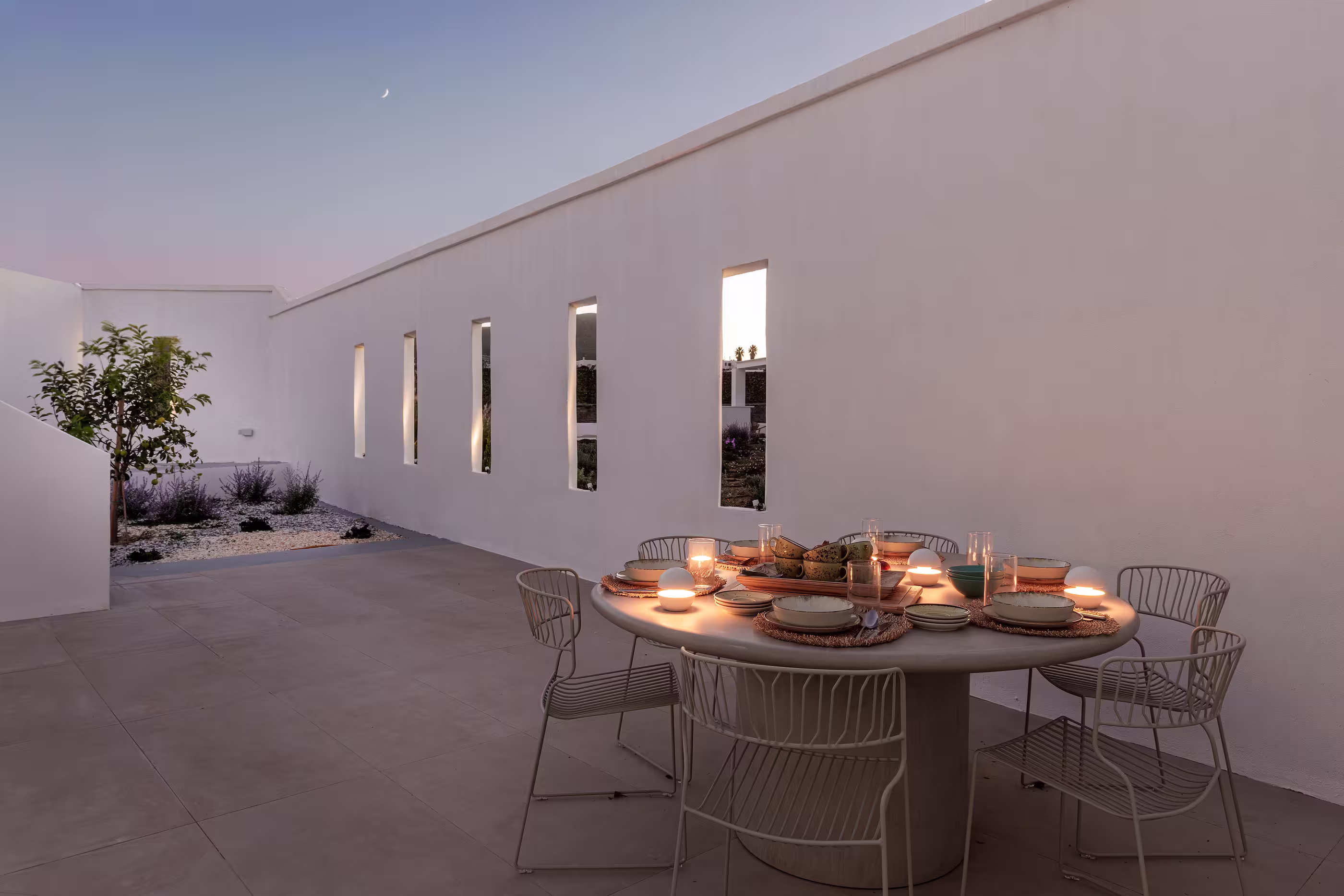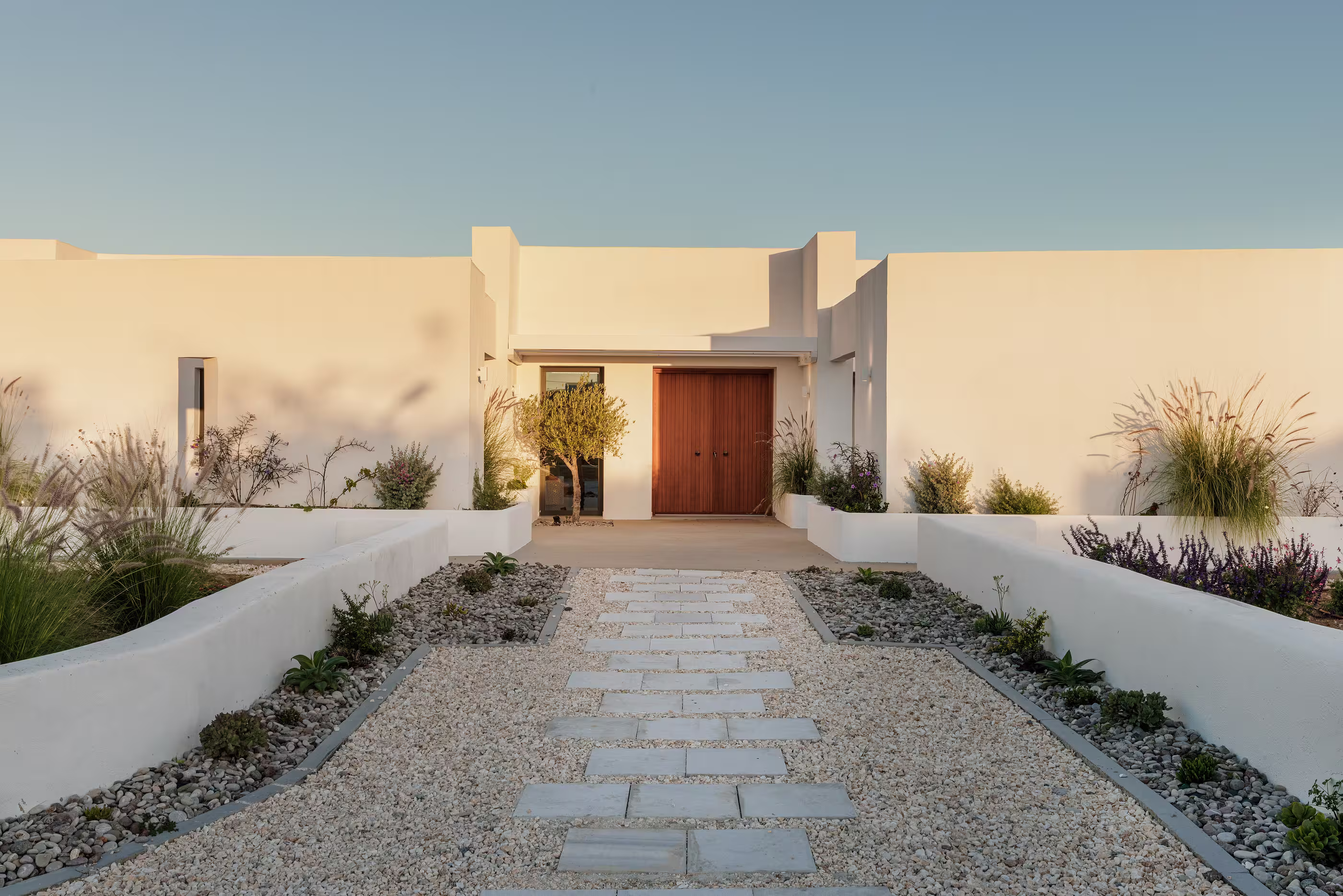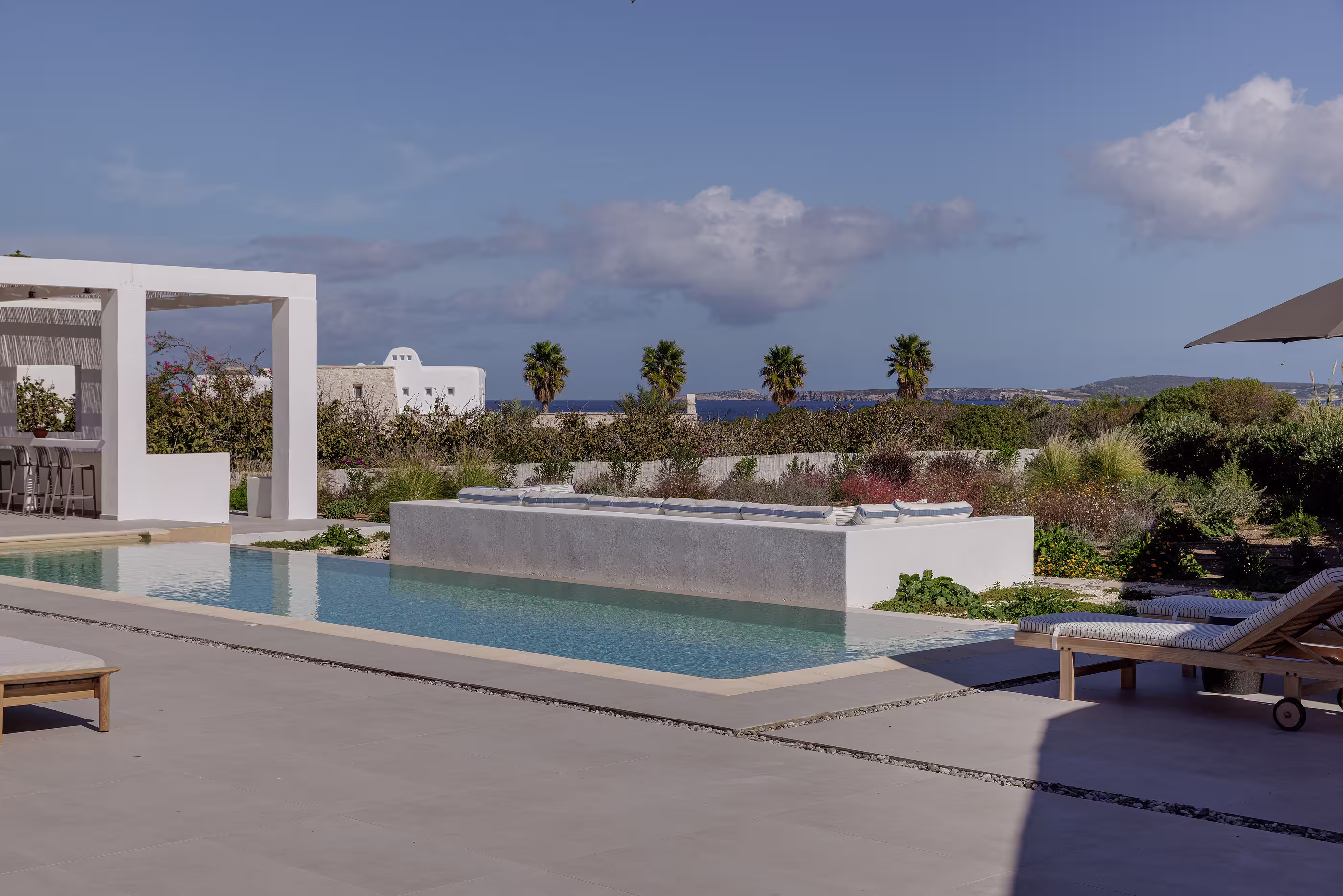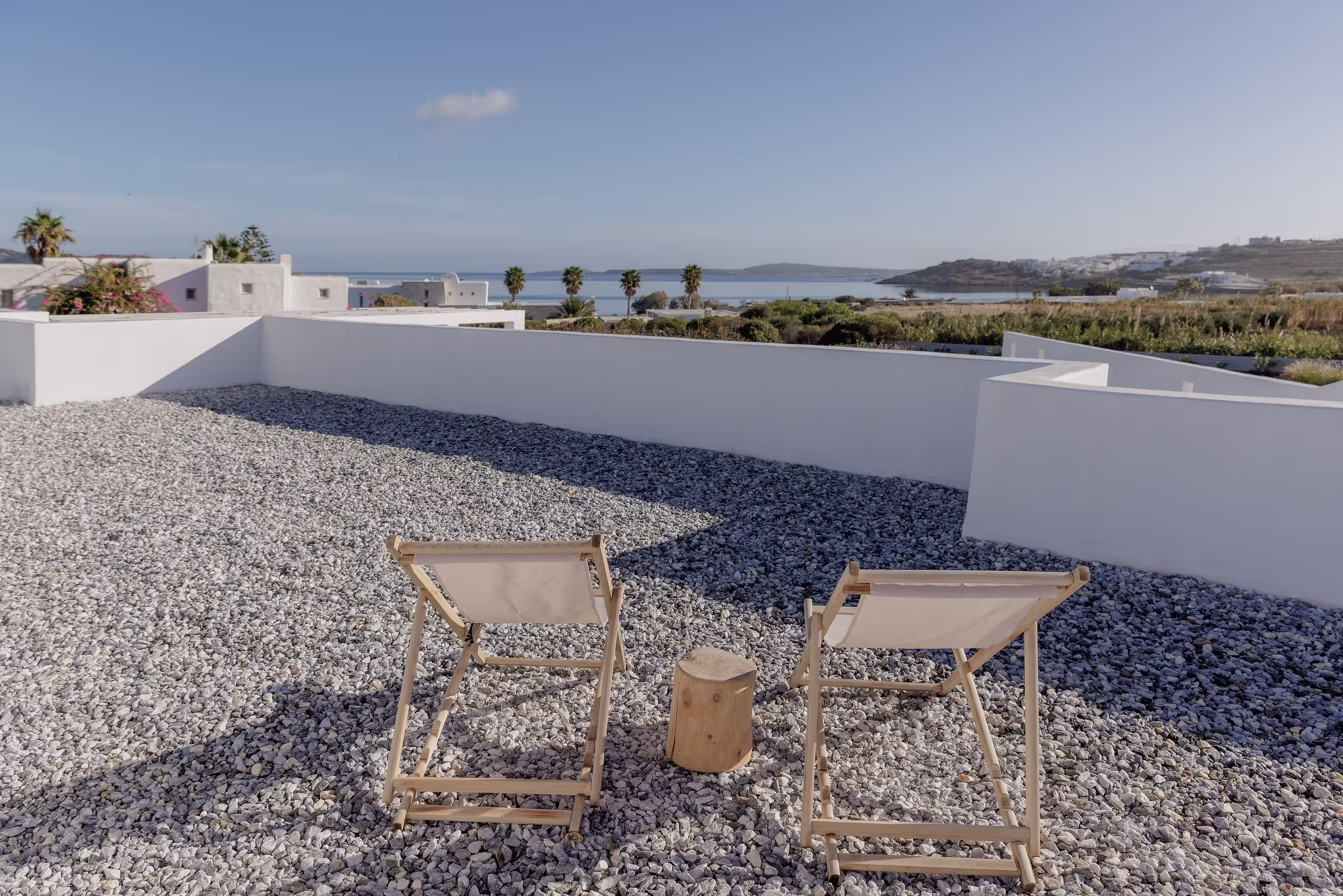 Warm natural interiors blending Cycladic architecture with contemporary comfort.