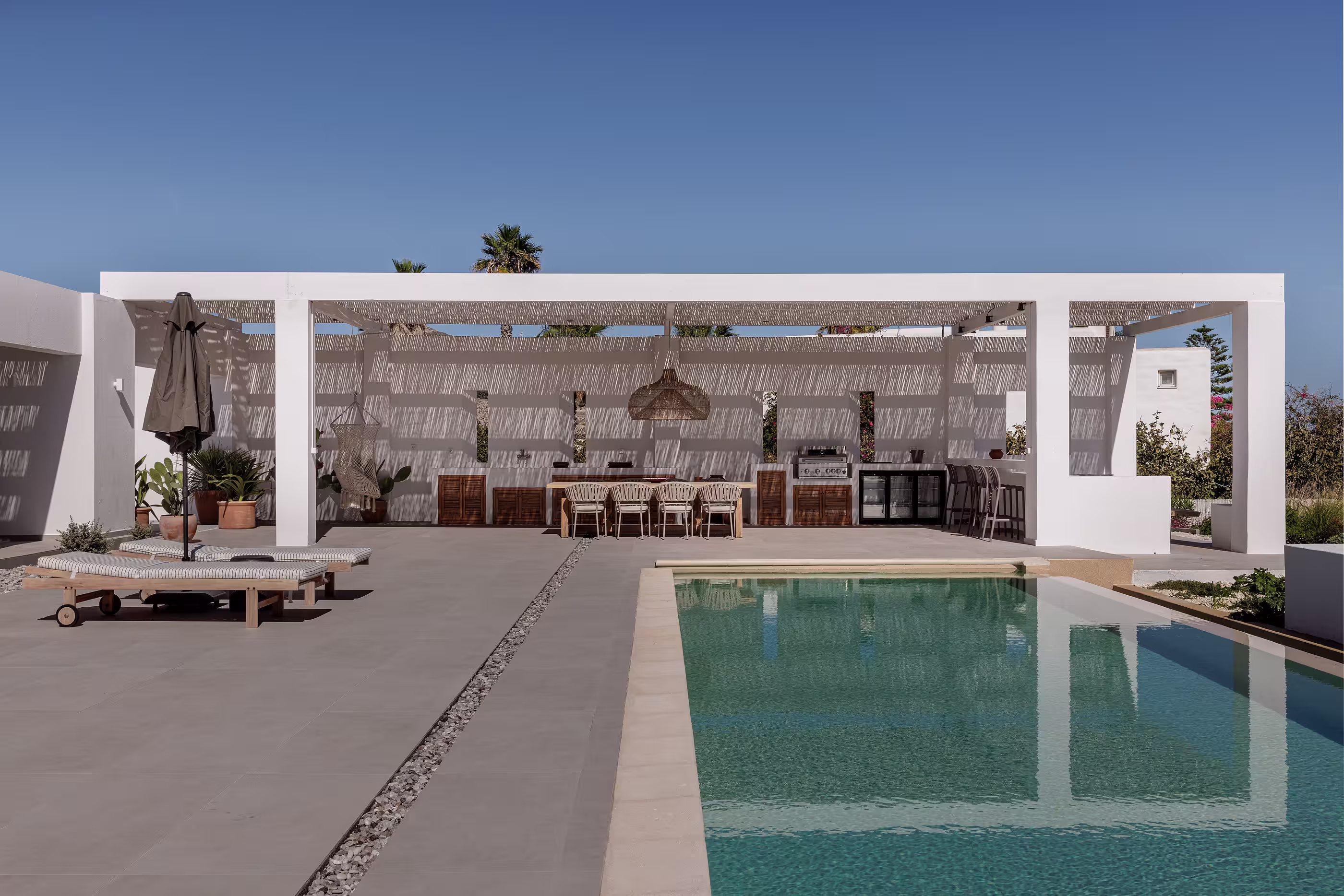Outdoors, the villa is thoughtfully arranged for elevated leisure and entertaining. A private swimming pool is complemented by a stylish sunken lounge, poolside relaxation areas, and multiple shaded dining spaces, along with a dedicated barbecue zone ideal for long, convivial meals. With its hillside setting, modern comforts, and serene surroundings, Villa Satori offers a sophisticated escape for guests seeking privacy, design, and proximity to one of Paros’ most vibrant destinations.