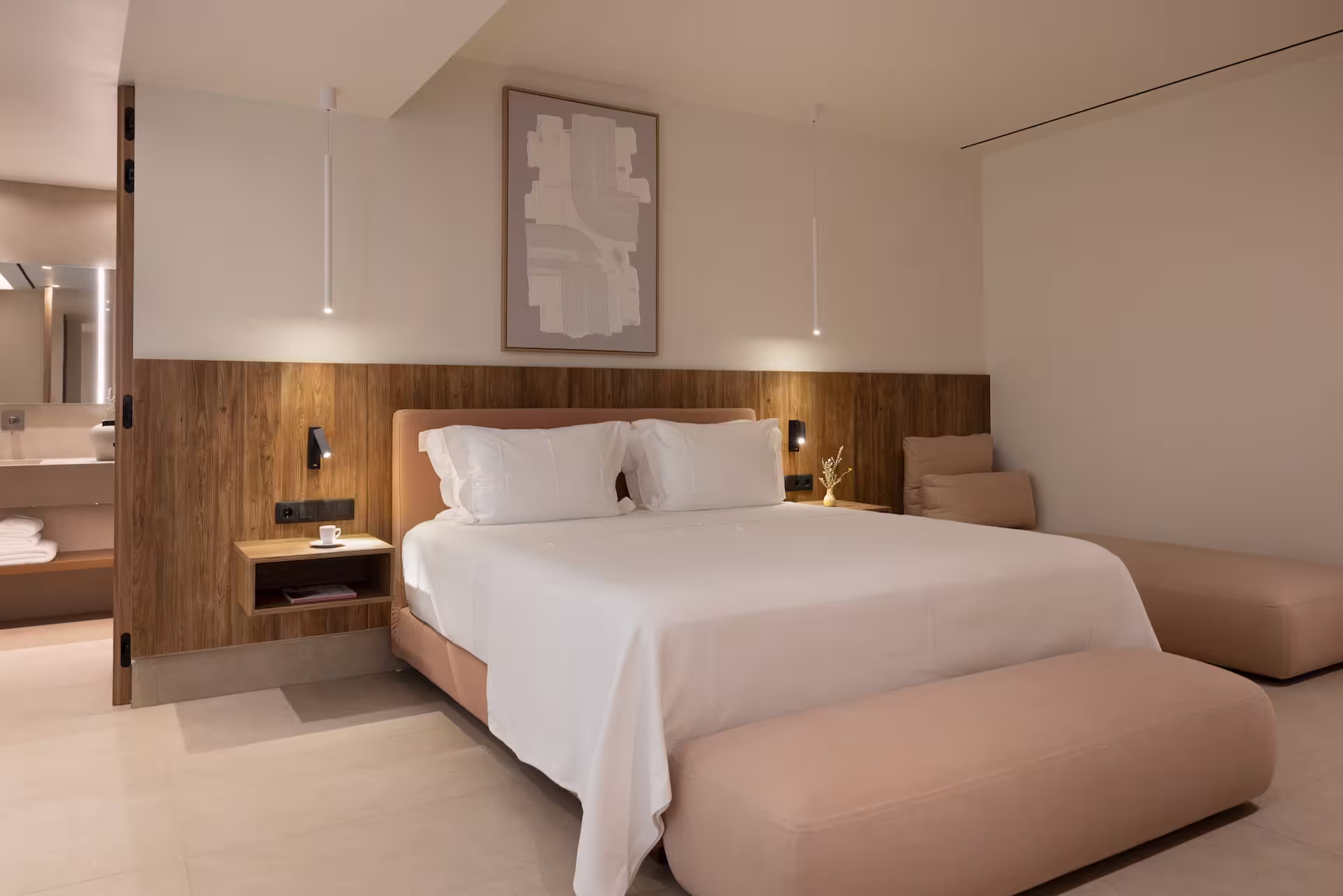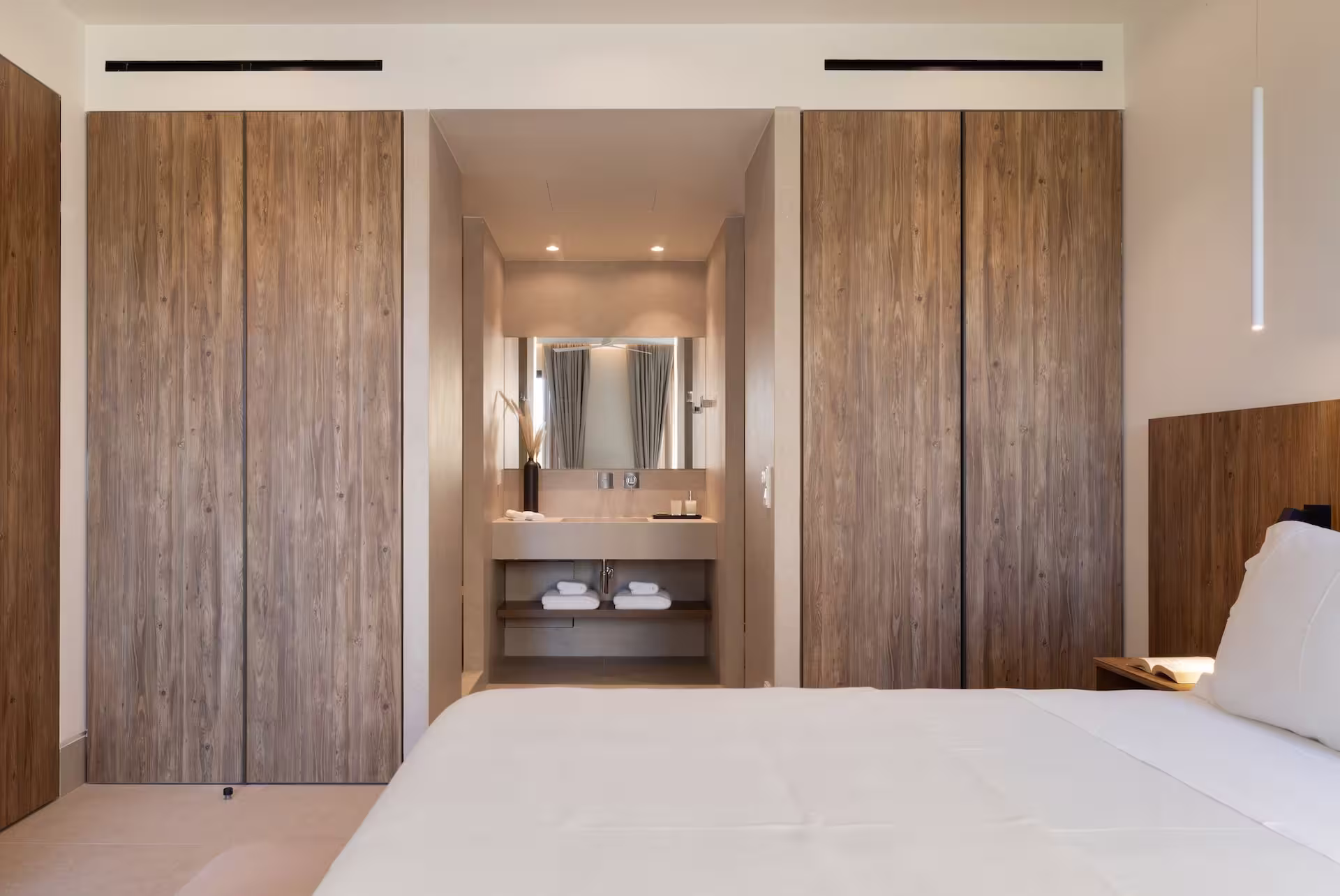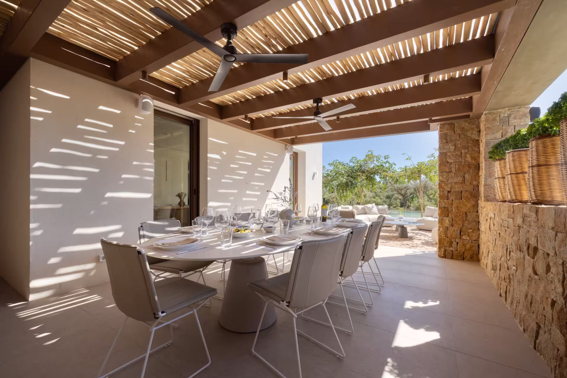 Villa Vela is the largest residence of its estate, offering generous interiors and refined architectural details within a beautifully landscaped private garden. With a large swimming pool featuring a jacuzzi and children’s section, the villa is designed for effortless relaxation and family enjoyment. A spacious central patio forms the heart of the home, creating a natural flow between indoor and outdoor living. The upper-level bedrooms open onto a balcony with calming sea views, while the recreation room provides a dedicated space for leisure. Wide openings fill the villa with natural light and maintain a constant connection to the surrounding greenery. Just moments from the pebble beach of Aliki, Villa Vela invites guests to swim from sunrise to moonlit evenings.